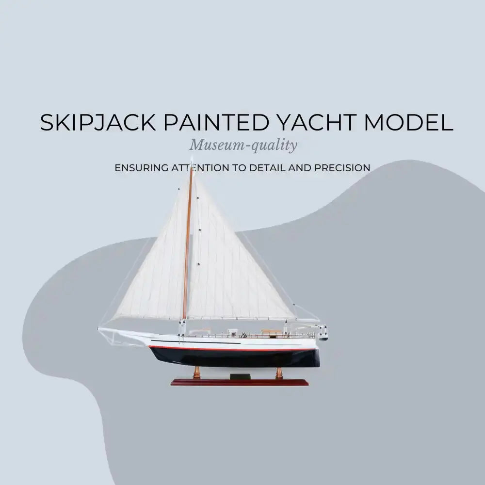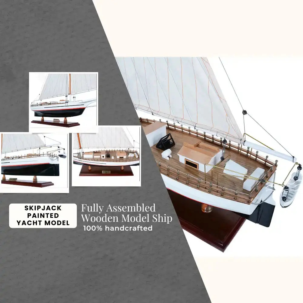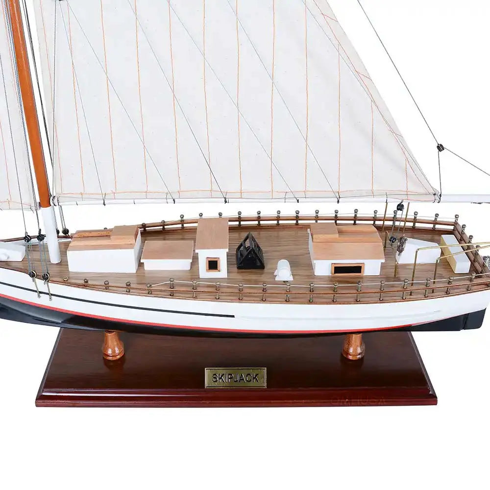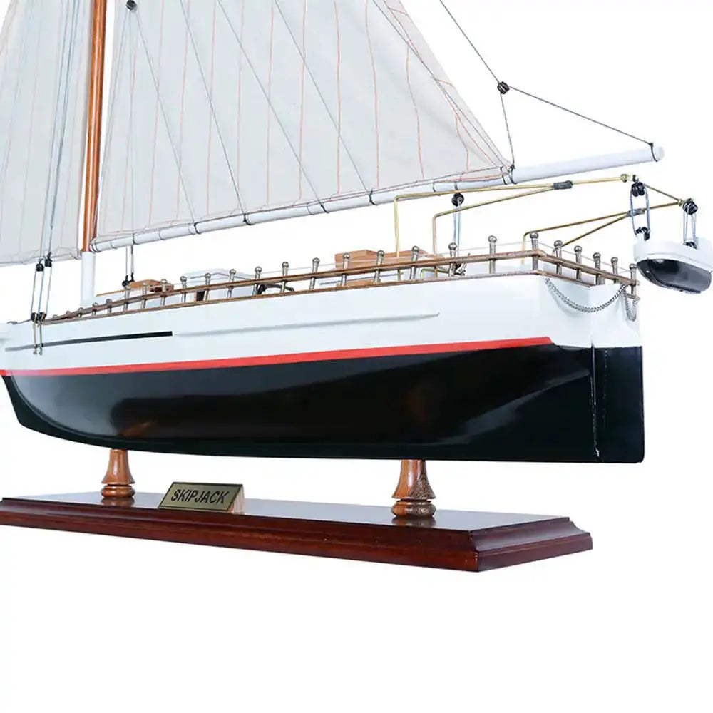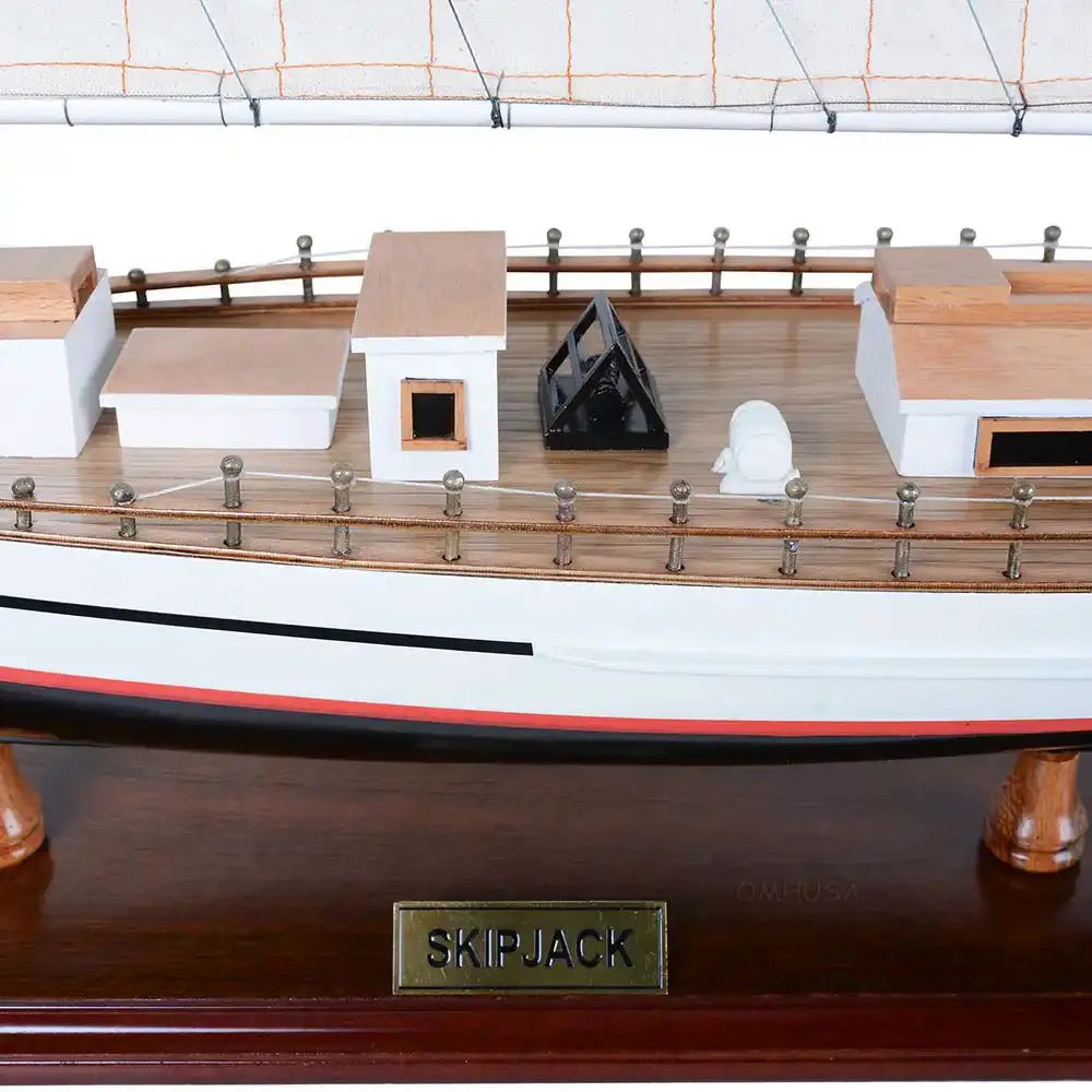 The Skipjack Painted (L80) is a fully assembled 29-inch handcrafted wooden model of the iconic Chesapeake Bay oyster boat. Built using the traditional plank-on-frame method, each detail is meticulously crafted by master artisans using high-quality wood such as mahogany, rosewood, and cedar. This authentic replica features hand-stitched sails, finely planked decks, intricate rigging, and chrome and brass fittings for an elegant finish. The model is securely mounted on a solid wooden base with a brass nameplate, ready for display in your home or office. Perfect for nautical enthusiasts and collectors, the Skipjack Painted model captures the heritage and charm of classic Chesapeake Bay fishing vessels.