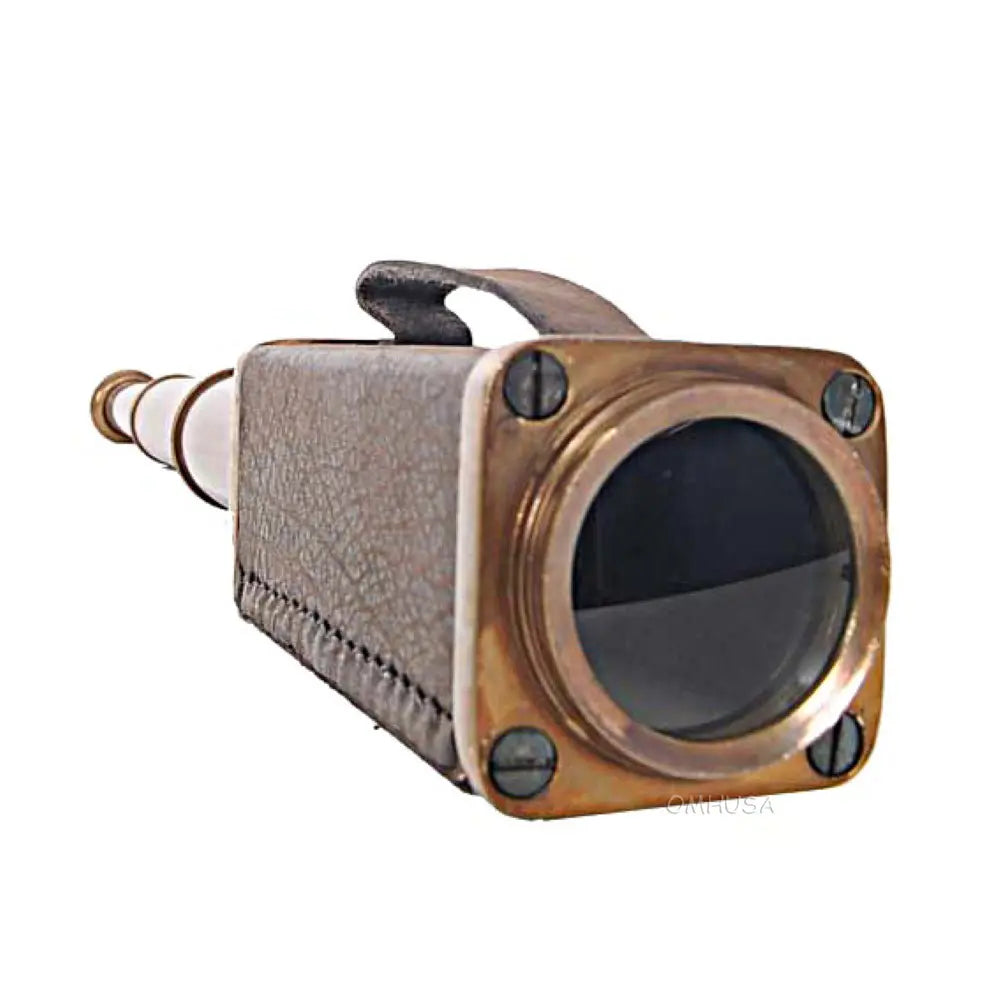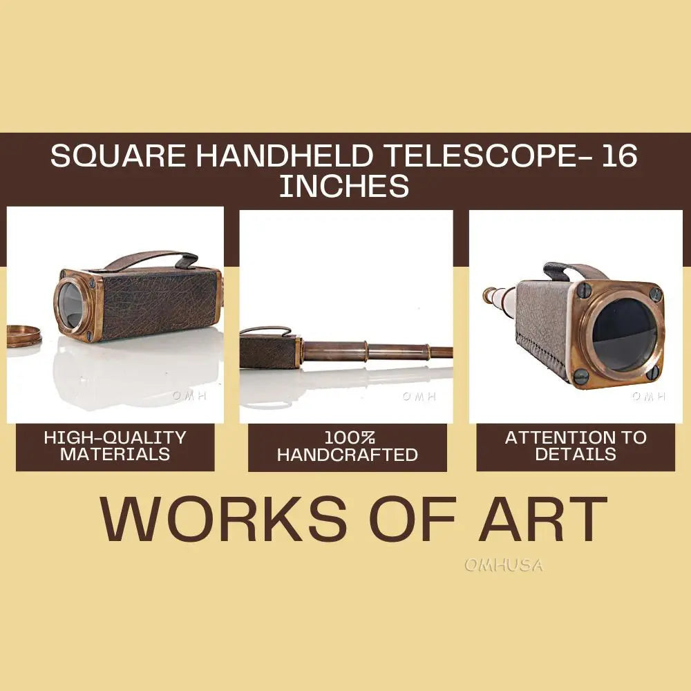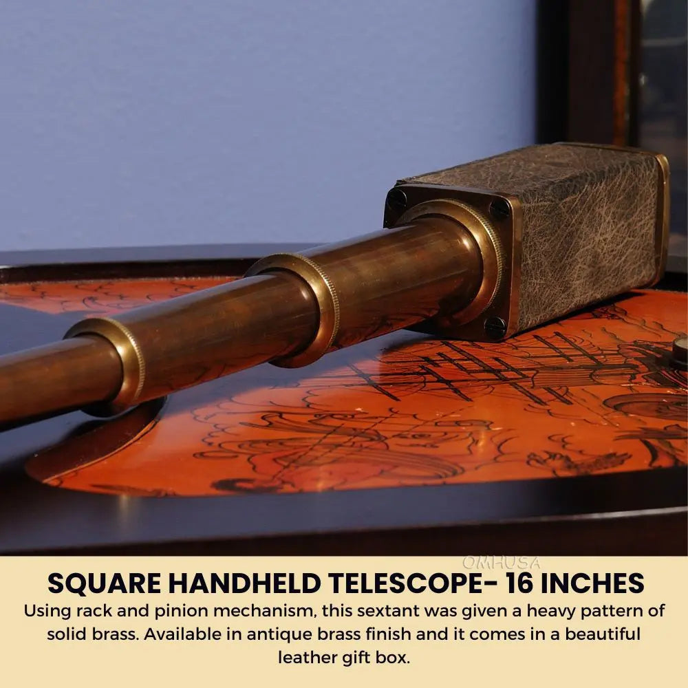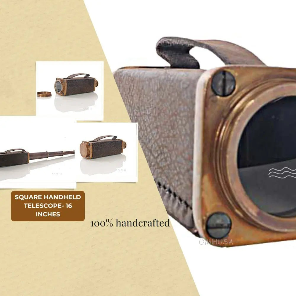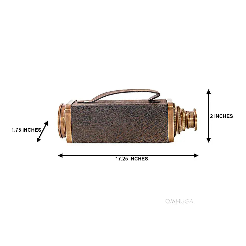 This square handheld telescope is crafted from high-quality brass and features an antique leather overlay for a rugged, nautical look. Measuring 17.25 inches extended, 1.75 inches wide, and 2 inches high, it delivers a magnifying power of approximately 6x, ideal for casual viewing or display. The telescope combines precise craftsmanship with functional design, making it both a collectible and a usable instrument. Perfect for nautical decor, maritime collections, or as a gift for enthusiasts, this telescope adds charm and authenticity to any space. Lightweight and portable, it can be easily handled for both decorative and practical purposes.