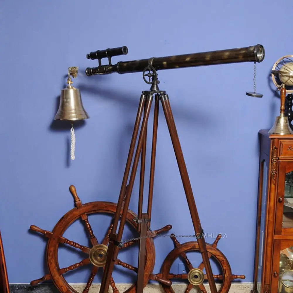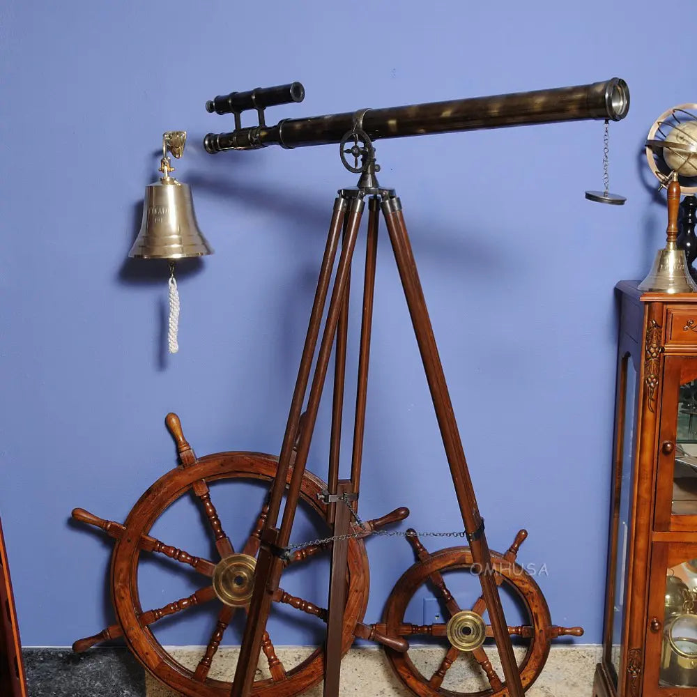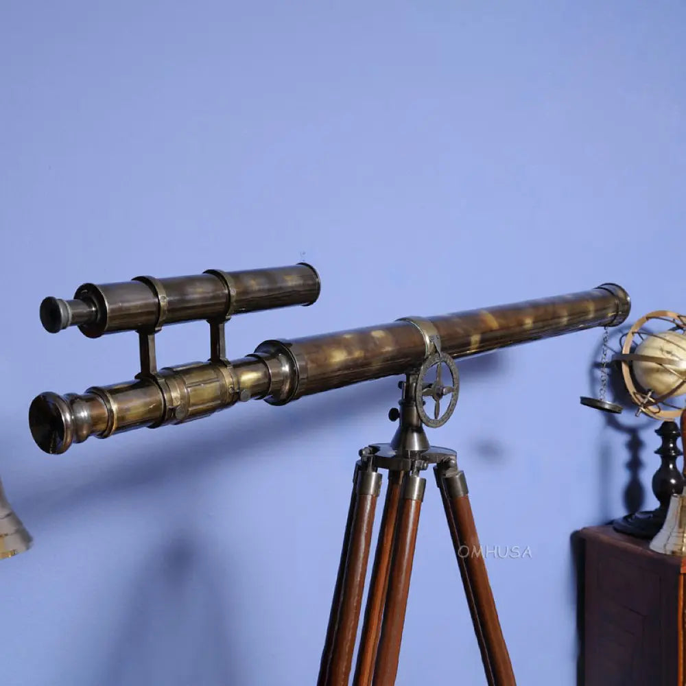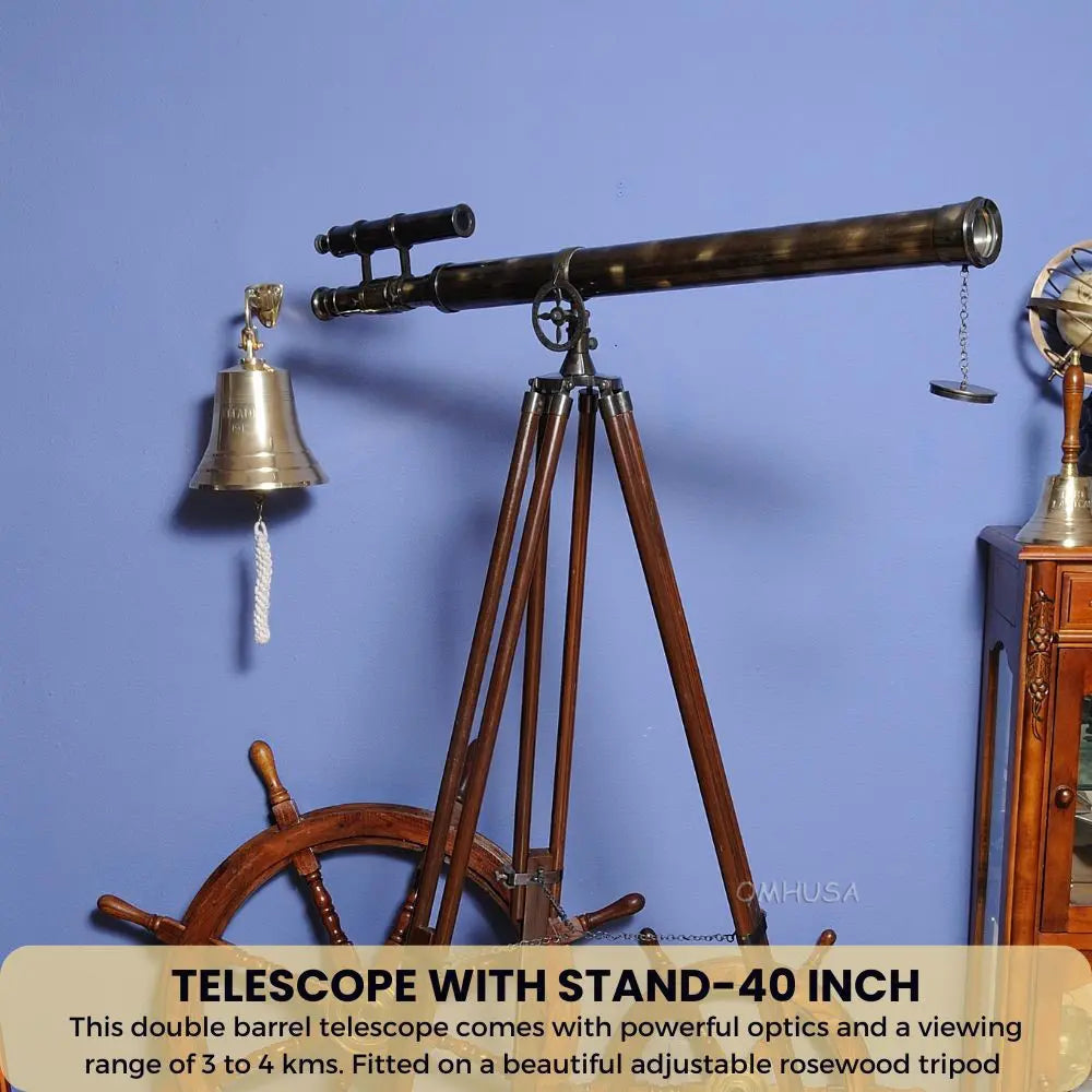 This fully functional harbor telescope features a brass body with an ebony finish for lasting durability and style. Crafted with meticulous attention to detail, the double barrel design offers powerful optics with approximately 10x magnification and a viewing range of 3 to 4 kilometers. Mounted on an adjustable rosewood tripod stand, this 40-inch telescope is ideal for nautical enthusiasts and home décor alike. Its compact dimensions (L: 40 in, W: 2.6 in, H: 62 in with stand) make it easy to place anywhere. Perfect for those seeking a blend of craftsmanship, functionality, and vintage maritime charm.