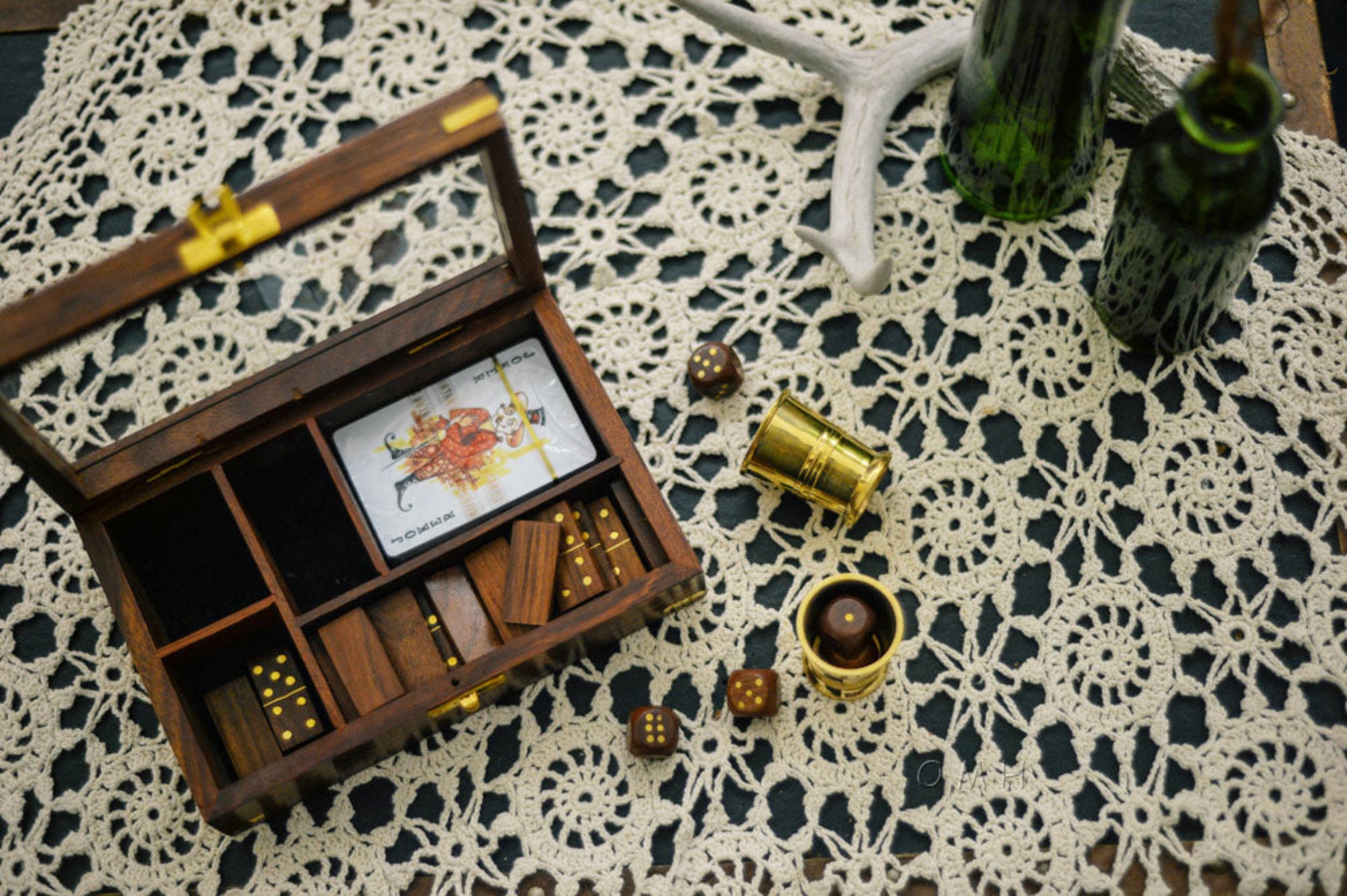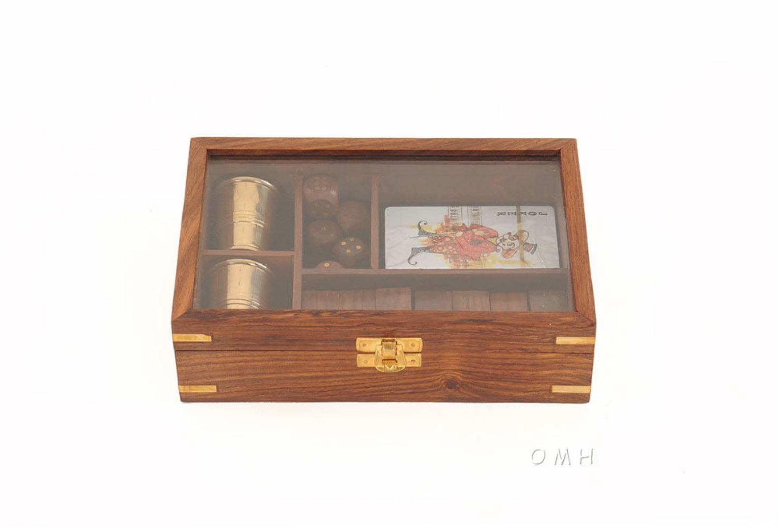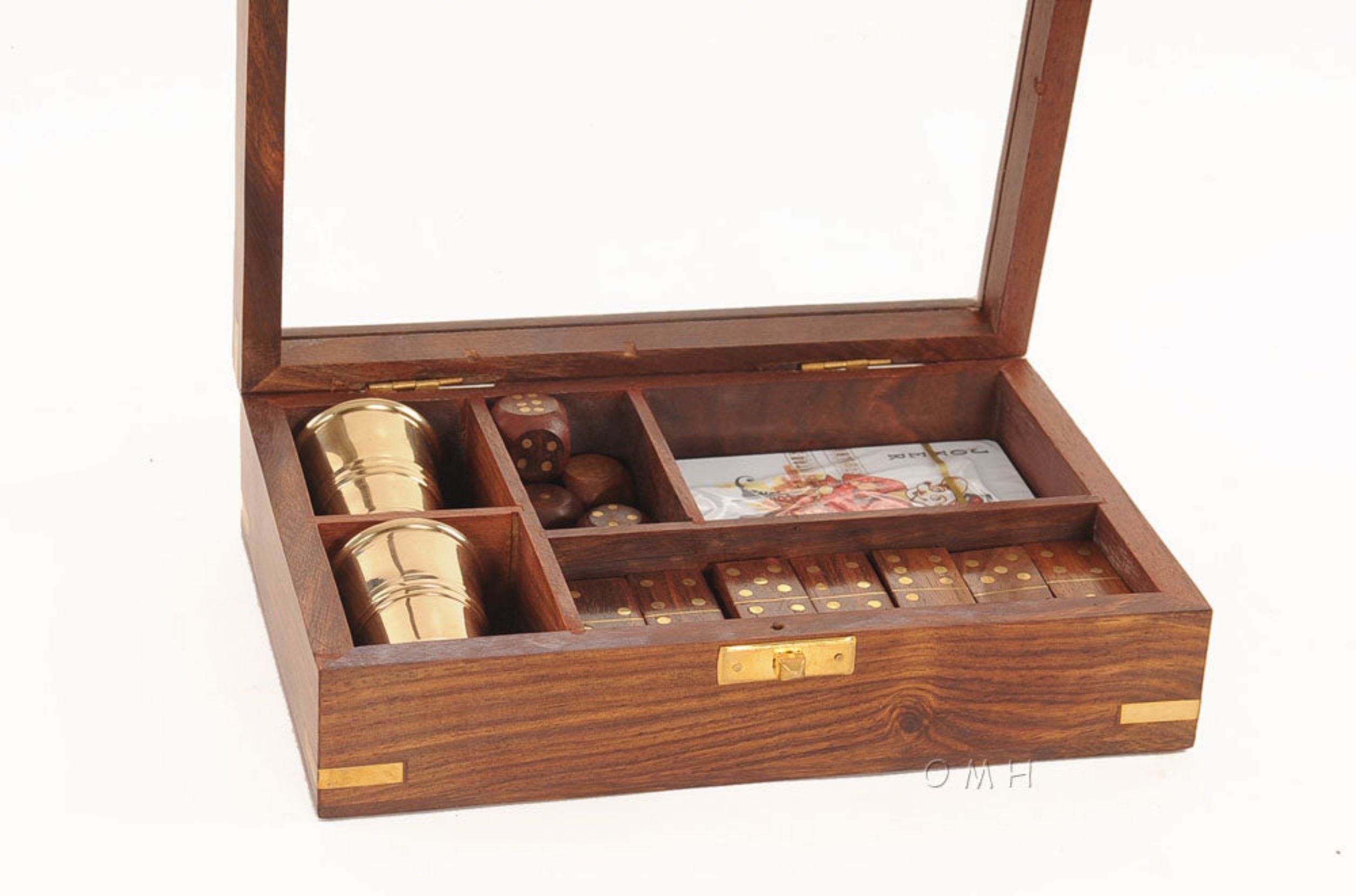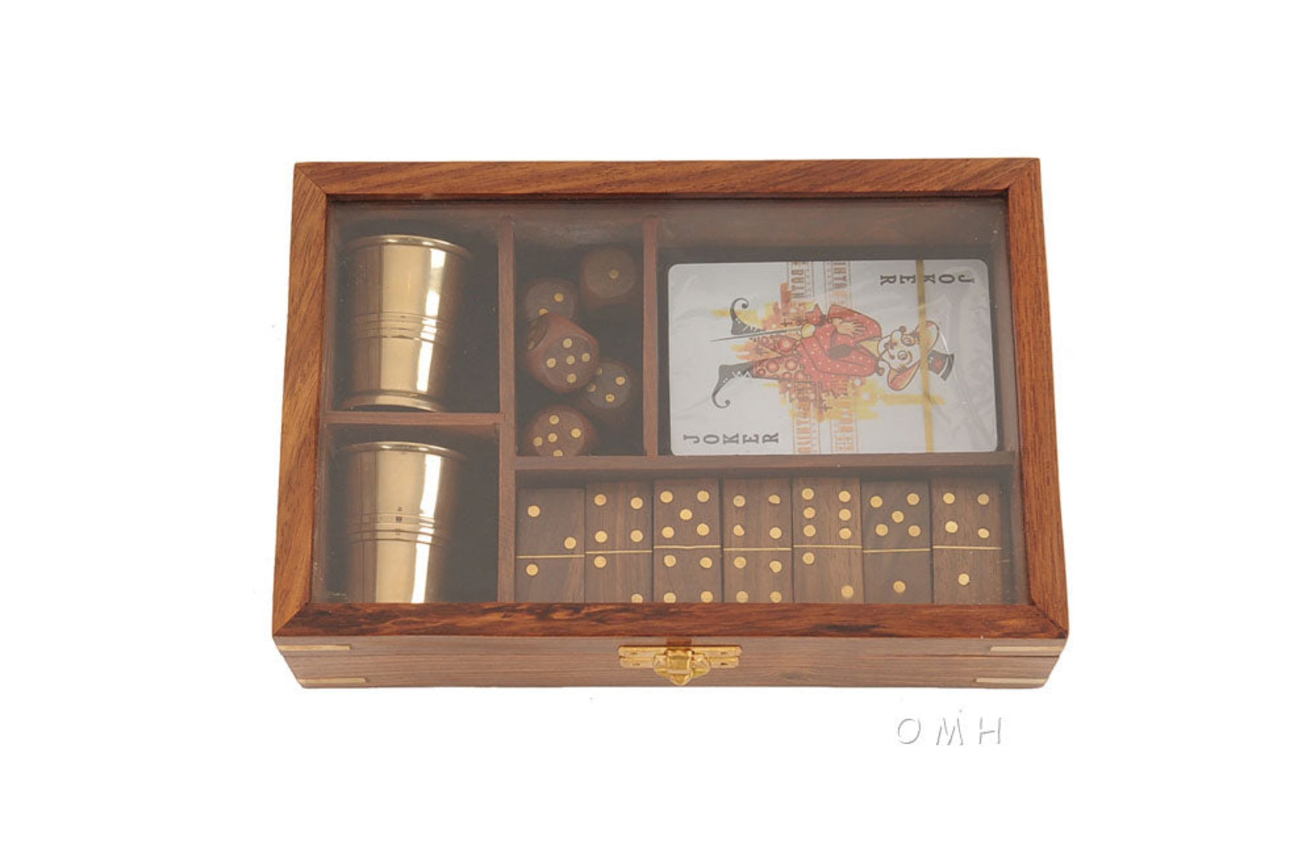 Wooden Game Set – Brass Goblet – Dice, Domino, Cards – 8" Compact Set By Old Modern Handicrafts