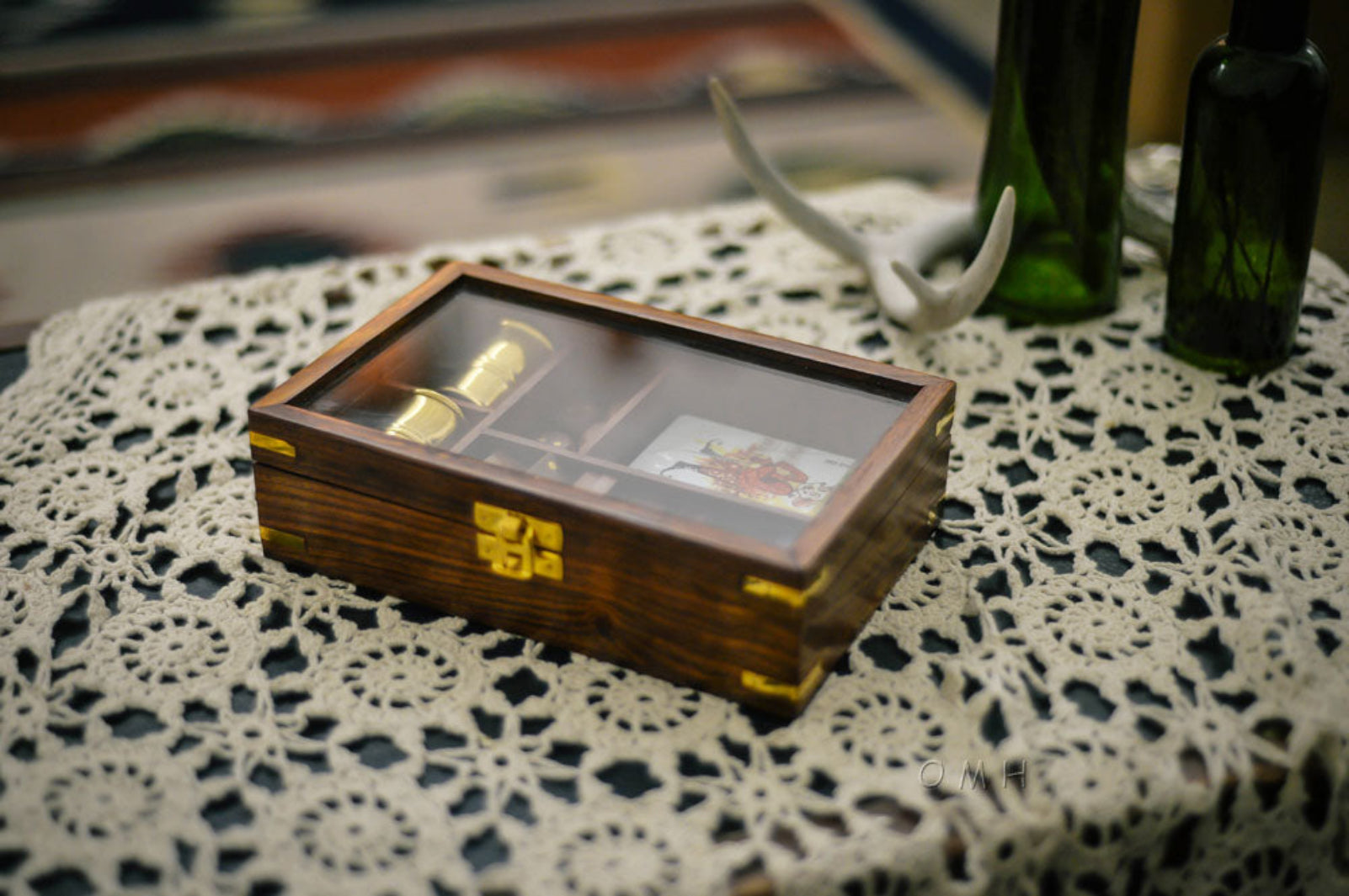 Wooden Game Set – Brass Goblet – Dice, Domino, Cards – 8" Compact Set