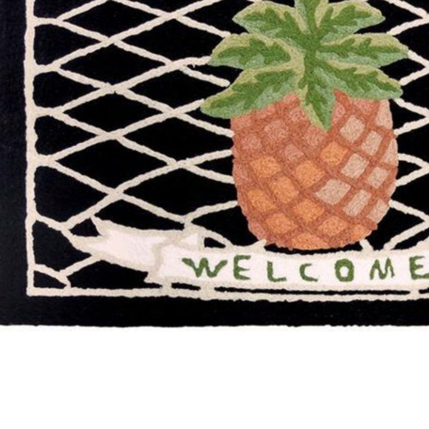 Welcome guests to your home or kitchen space with this inviting pineapple of brown and green. The black and beige patterned background mimics the textured etching of the pineapple`s skin. This machine washable Jellybean accent rug design is suitable for indoor and outdoor use and includes recycled materials in its crafting.