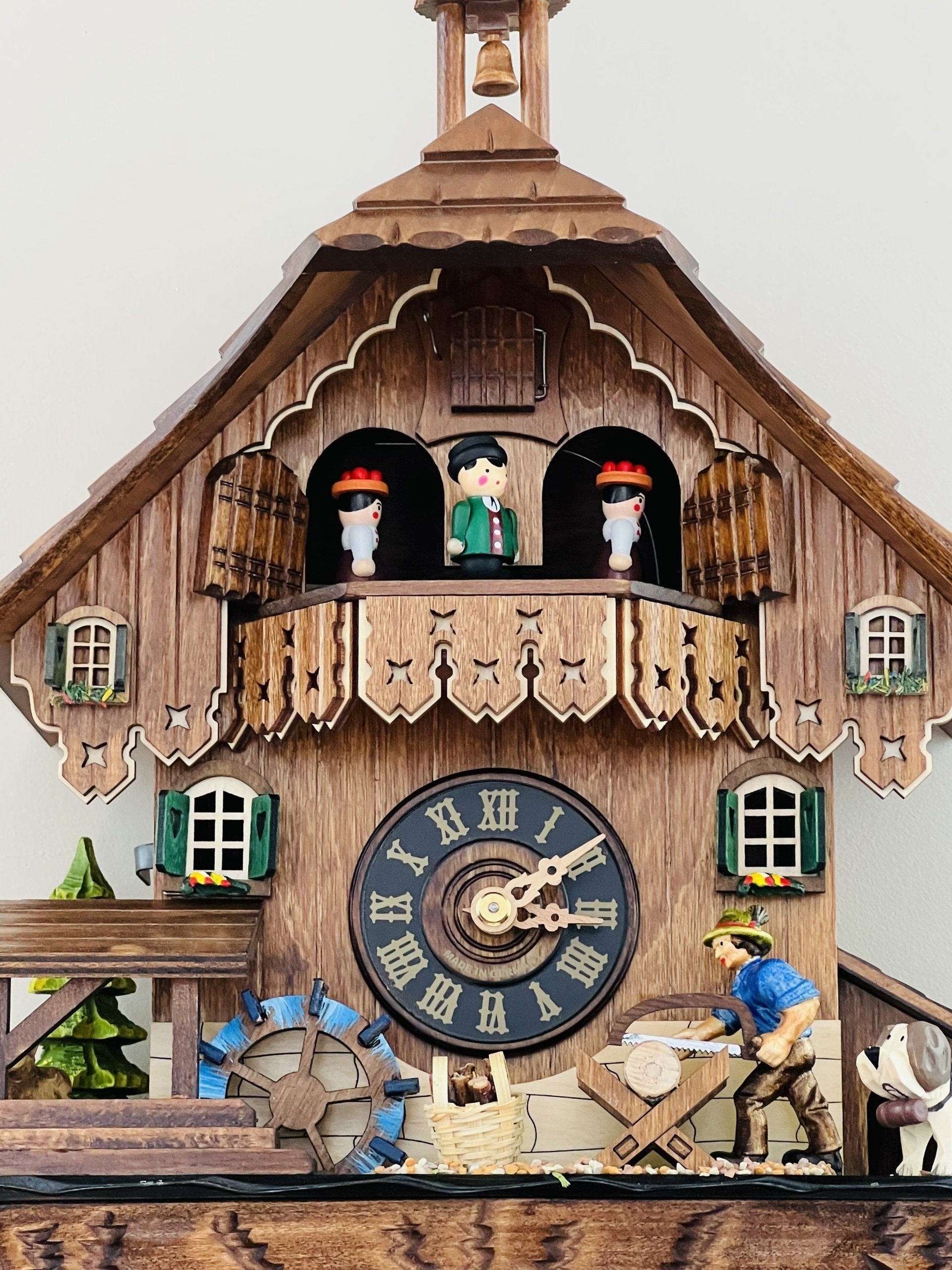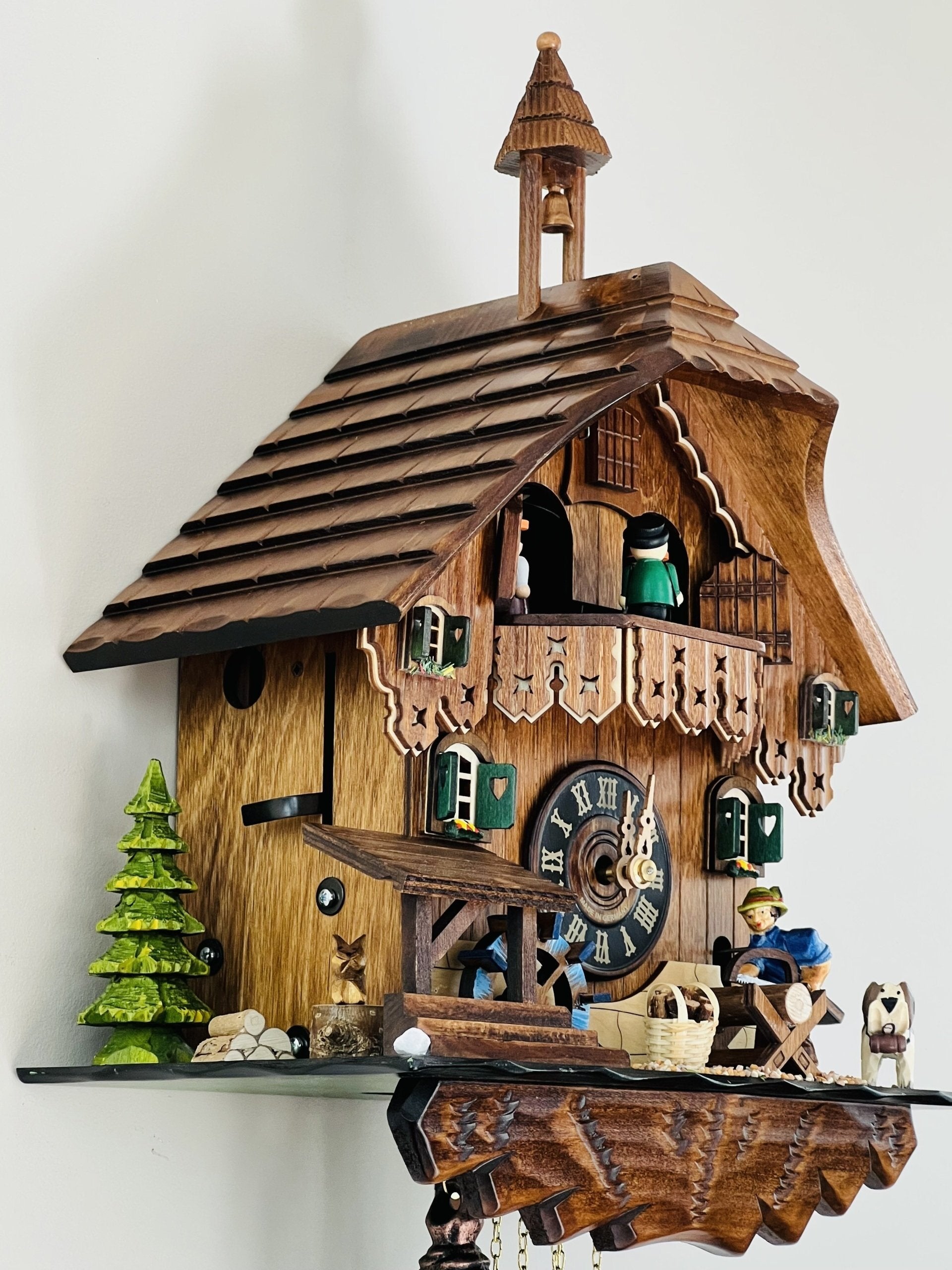At every hour and half-hour, the woodcutter comes to life, the waterwheel rotates, and the dancers atop the dial gracefully revolve in rhythm with one of two iconic 22-note melodies—Edelweiss or The Happy Wanderer. The hand-carved cuckoo bird emerges from its charming door to call the time, offering a classic and delightful experience for collectors and décor lovers alike.