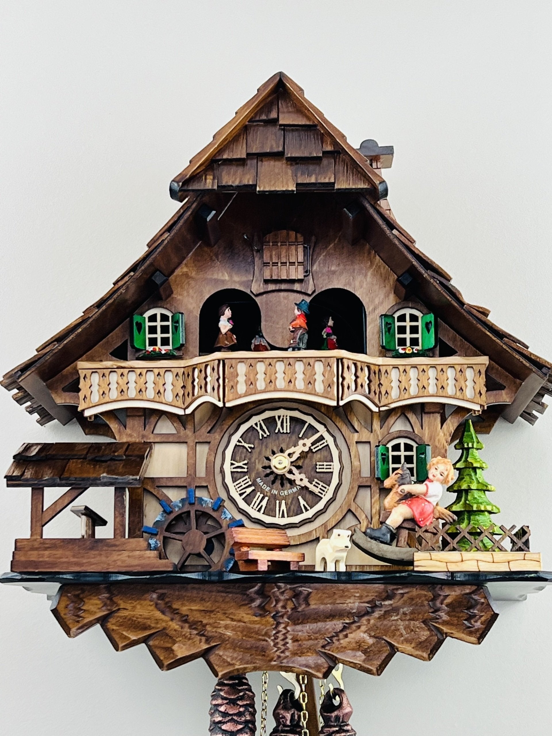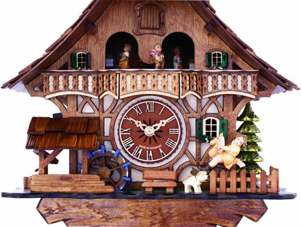 Bring home a beautifully authentic piece of the Black Forest with this 13-inch One Day Musical Cuckoo Clock, crafted in Germany with timeless detail and old-world charm. Designed in a classic chalet style, this clock features hand-carved elements, a girl on a rocking horse, and a smooth-turning waterwheel—all synchronized with music and movement. Every hour and half-hour, the dancers rotate gracefully while the rocking horse and waterwheel come to life. The warm, hand-painted cuckoo bird appears from its tiny door to announce the time with its traditional call. Two beloved melodies—Edelweiss and The Happy Wanderer—alternate with each cycle, creating a nostalgic experience that enriches any living space.