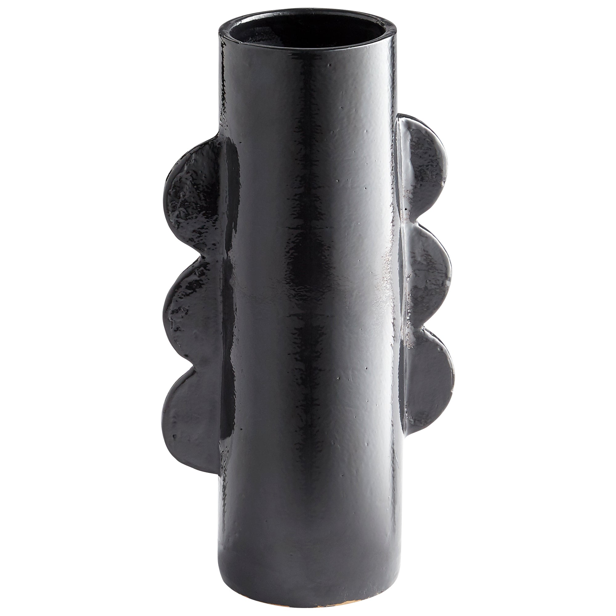 This artisan crafted terracotta vase collection features a rustic glazed black finish, with an abstract form influenced by ancient Native American pottery. A cylindrical design with a muted totem pole design, this collection is the perfect addition to any subdued organic ensemble, or boho-chic arrangement