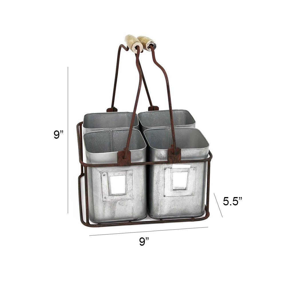 Infuse rustic farmhouse charm in your home with the inclusion of this galvanized 4 Tin Organizer. The movable wooden handles offer portability and the tins are encased in a rustic iron frame. Each tin comes with a removable label to mark for specific usage. A perfect piece for any tabletop, this appealing gray finish organizer is sure to add uniqueness to your Decor.