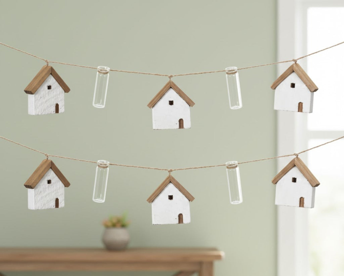 - Set of 2 wooden garlands featuring house and vase shapes
