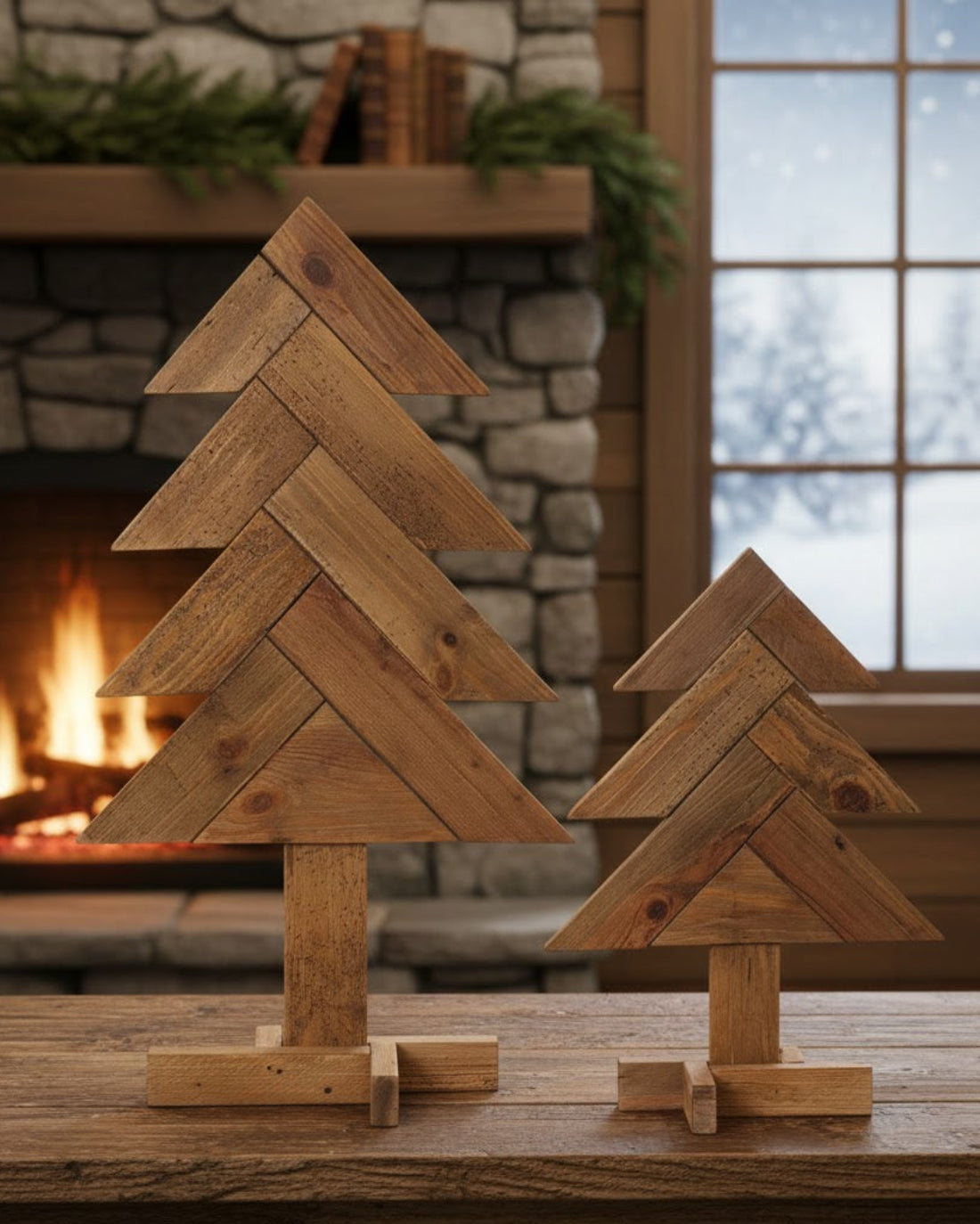 - Set of 2 tall pine wood Christmas trees