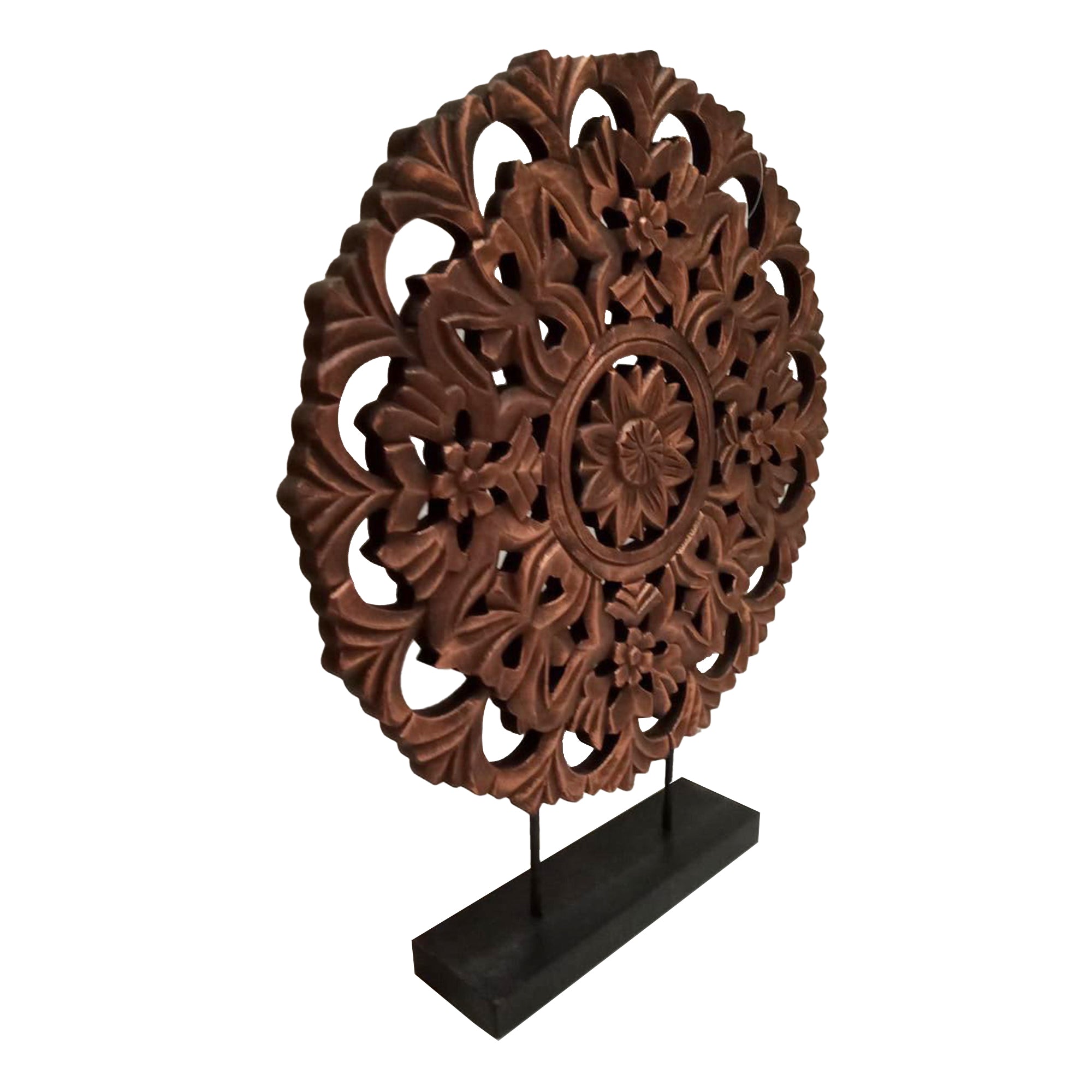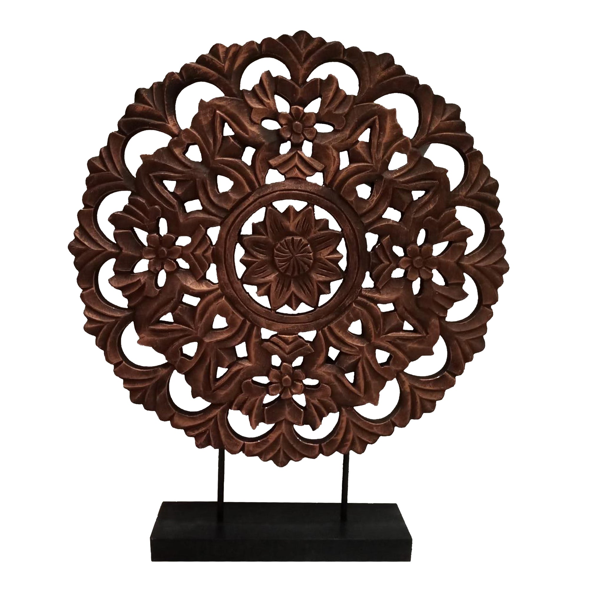 The Urban Port Intricately Carved Round Wooden Wheel on Rectangular Stand, Rustic Brown, Small
