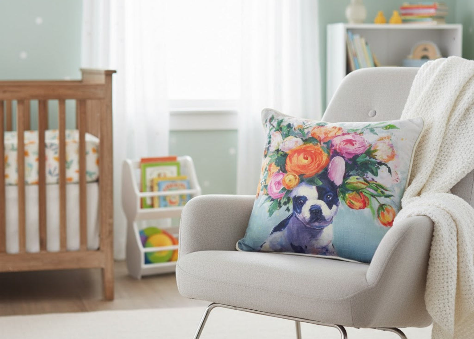- Features French Bulldog with floral design