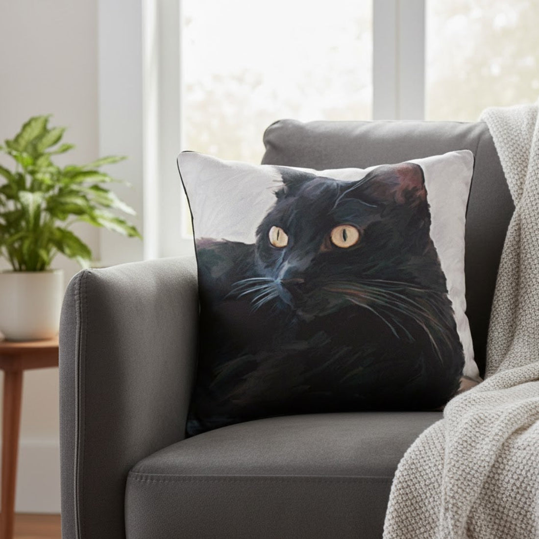 Decorative Pillow Black Cat Portrait – 18 Inch by Manual Woodworkers