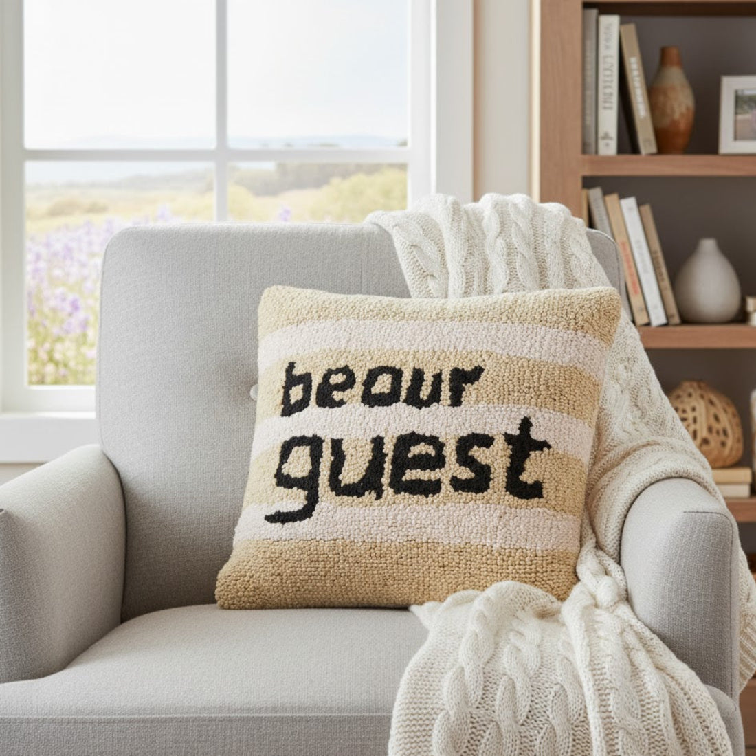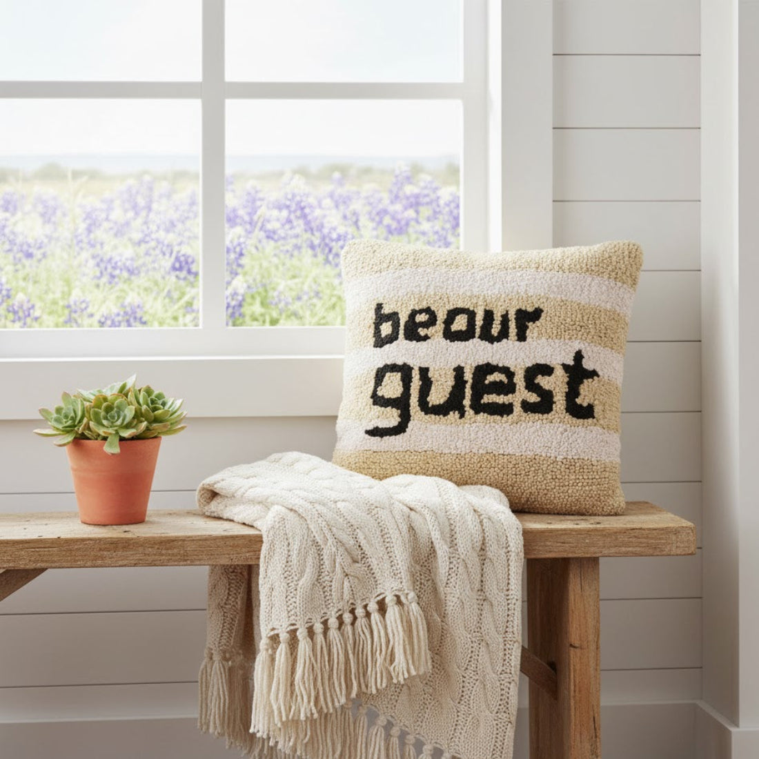 Create a warm and inviting atmosphere in your home with the Be Our Guest Hooked Pillow Cover (12x12 inch). Made from a soft cotton blend enhanced with wool, polyester, rayon, and nylon, this charming cover features a hooked-texture design with the welcoming phrase “Be Our Guest.” Its handcrafted appearance and cozy texture make it a perfect accent for guest rooms, entryways, or living areas. Designed to fit a standard 12x12 inch pillow insert, it brings both comfort and personality to your home decor. The durable fabric composition ensures lasting quality, while the uplifting message adds a friendly touch guest are sure to appreciate.
