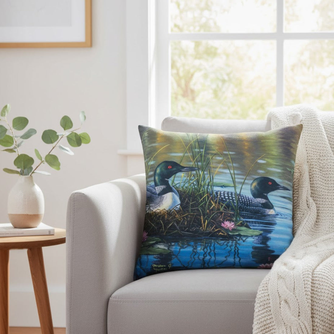 Bring the calm beauty of the outdoors to your home with the Loon Pair 18" Climaweave Pillow. Made from 100% polyester, this durable pillow features a stunning loon pair design that captures the tranquility of lakeside wildlife. The Climaweave fabric is specially crafted for indoor and outdoor use, offering fade resistance and all-weather durability. Perfect for lake houses, cabins, patios, or cozy living rooms, it adds both comfort and natural artistry to any setting. Quick-drying and easy to maintain, this pillow is ideal for anyone who loves rustic charm and nature-inspired décor.