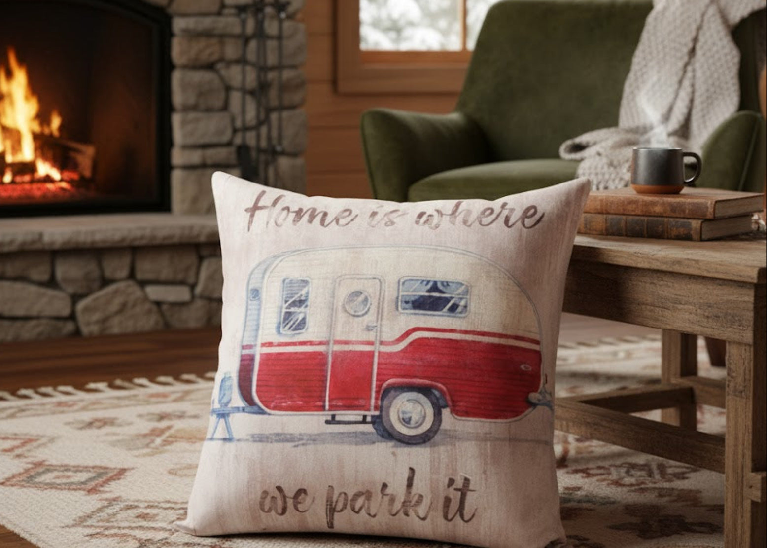 - Features “Home Is Where We Park It” camper design