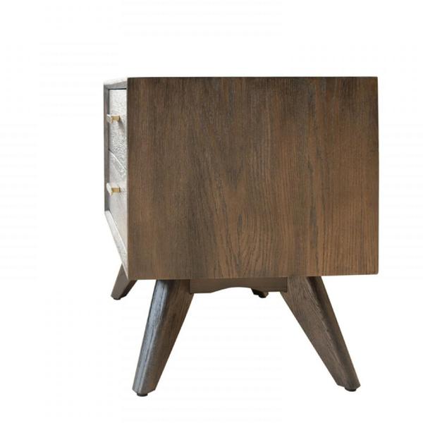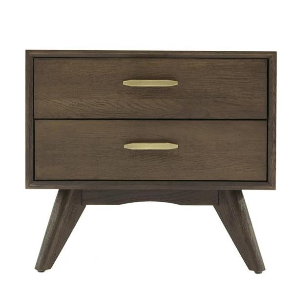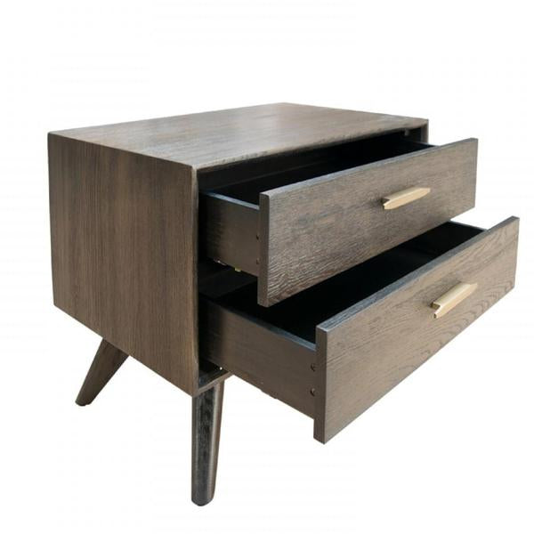 Add a transitional vibe to your room with this sturdy wooden constructed Nightstand, featuring 2 storage drawers with antique brass handles that provide ample storage. It is constructed with dark oak veneer finish with slanted legs. This will give your bedroom a deluxe look.