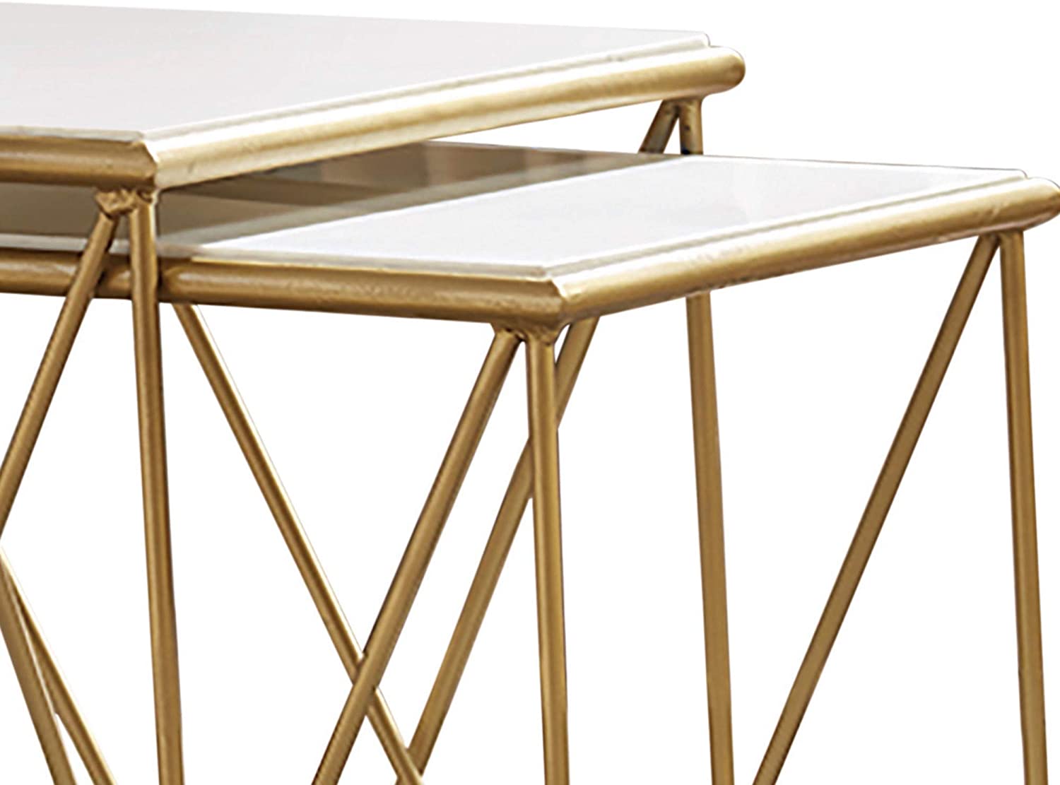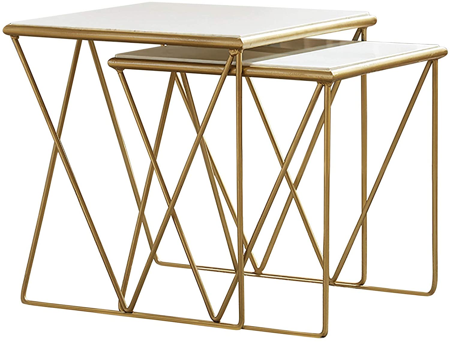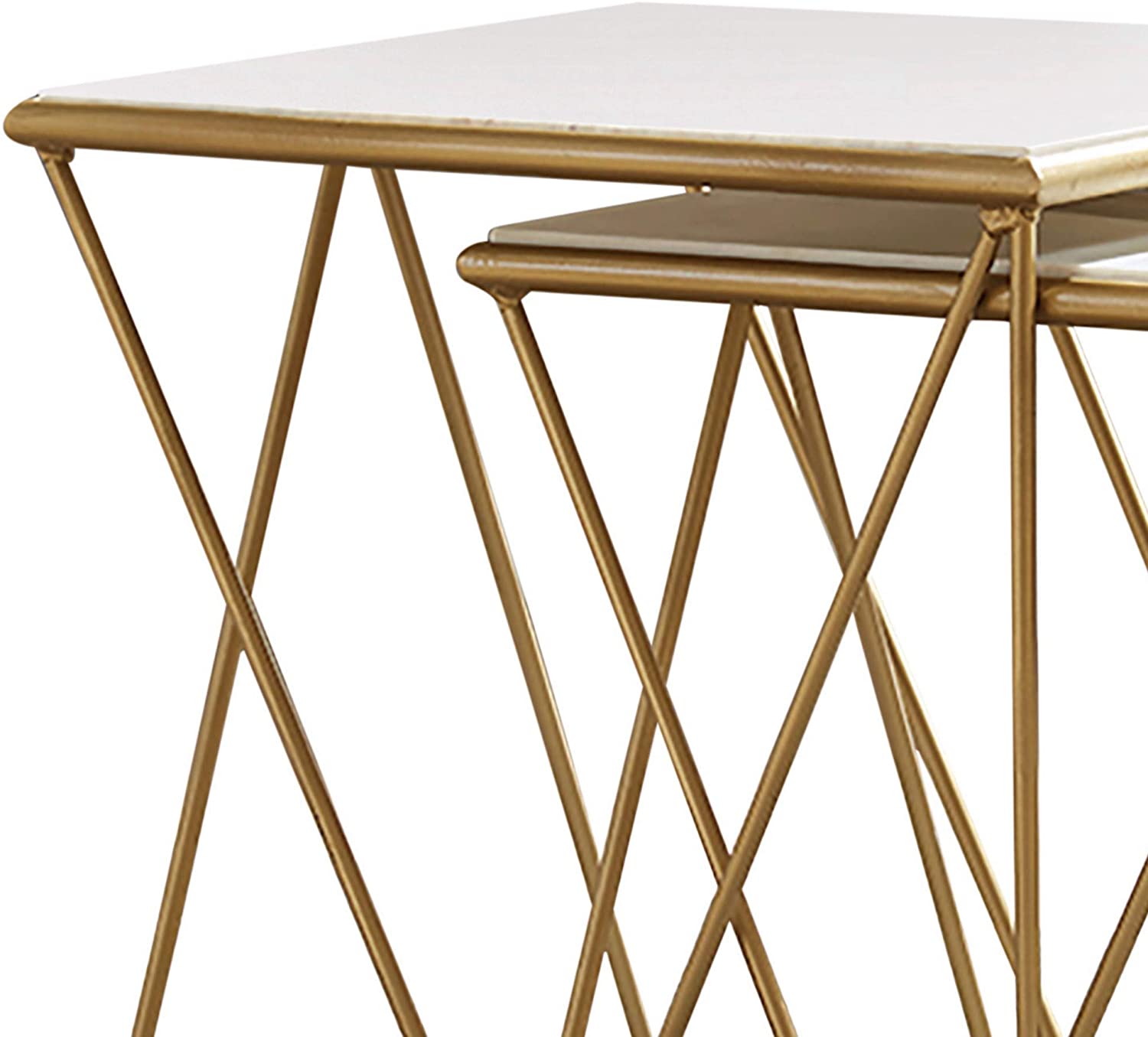 Benzara 2 Piece Marble Top Nesting Table with Geometric Base, White and Gold
