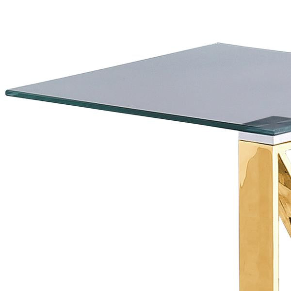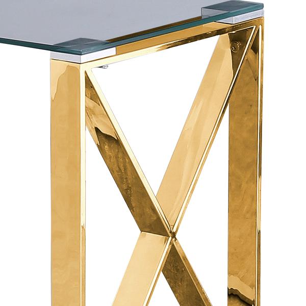 Add a contemporary element to your Decor setting with this exclusive Side Table. Incorporating a gold finish stainless steel frame with an X design, it features an elegant glass tabletop. This Side Table will surely be an eye catching Decor piece in the living room.