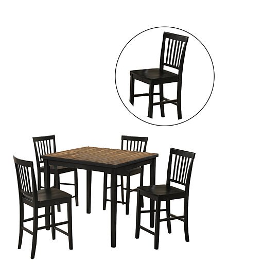 Enjoy sophisticated dining by incorporating this contemporary style 5 Piece Counter Dining Set which consists of 1 Table and 4 Chairs with slatted backrests. Constructed from the combination of solid wood and Veneer, the table is accented with brown and black finish whilst the chairs are accented with striking black color finish.