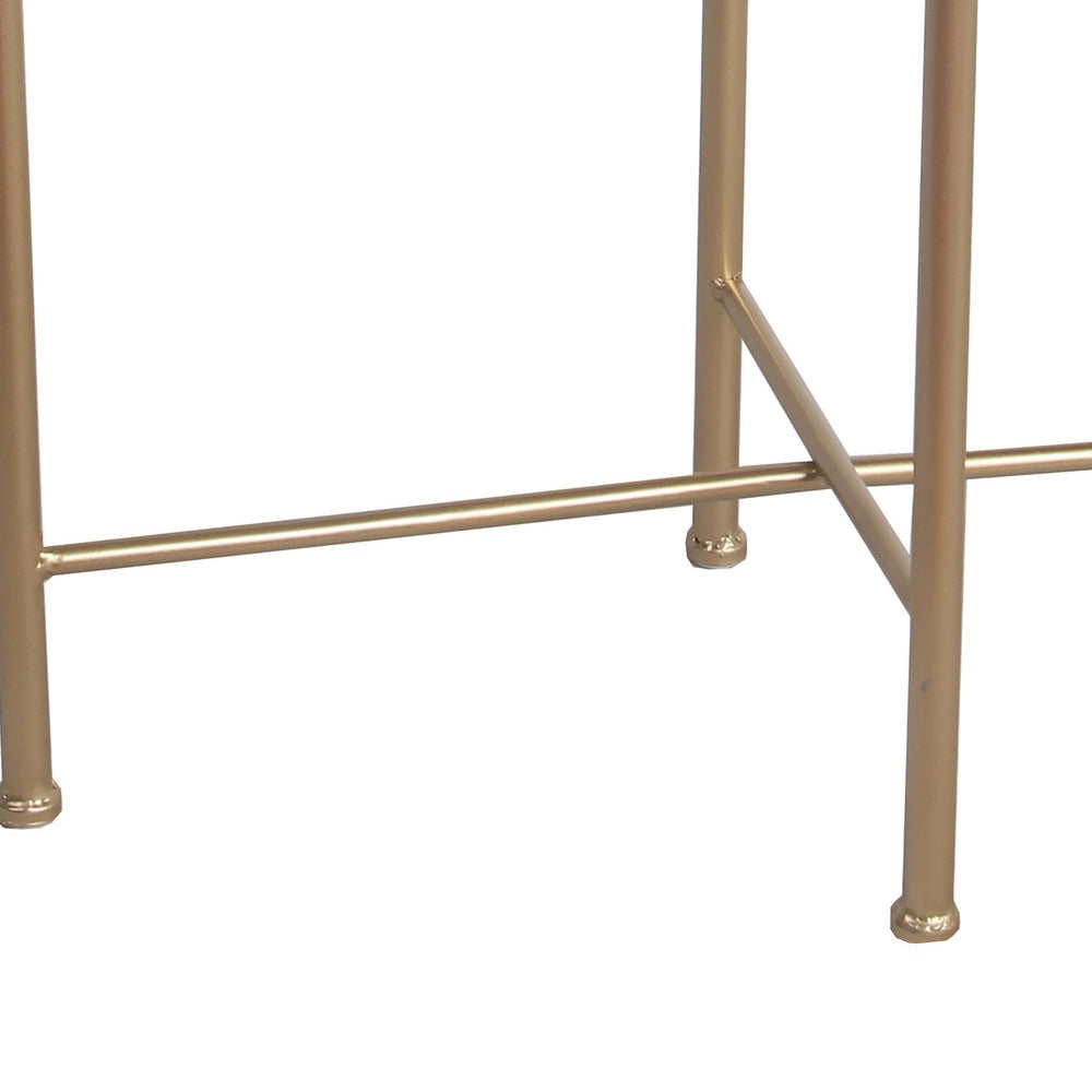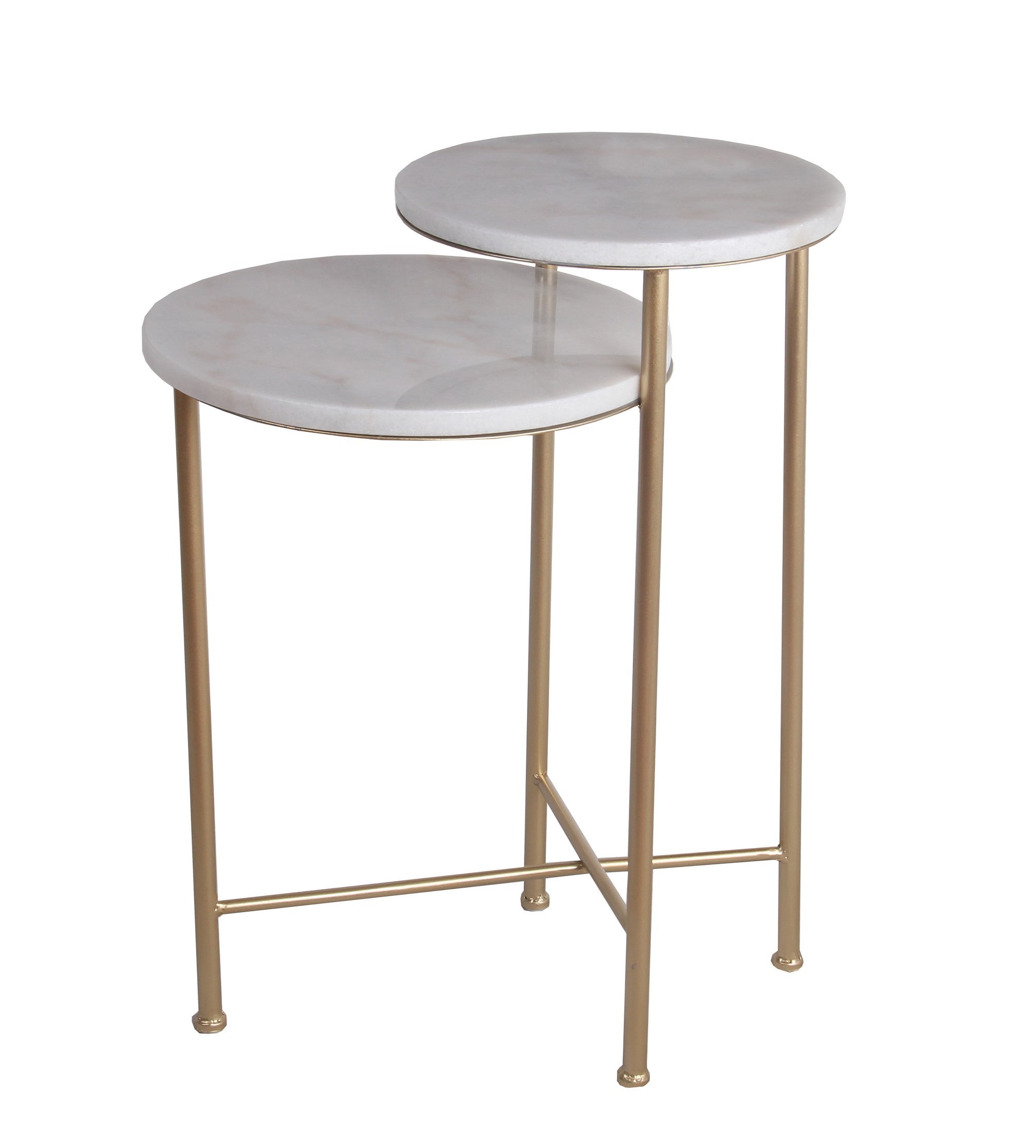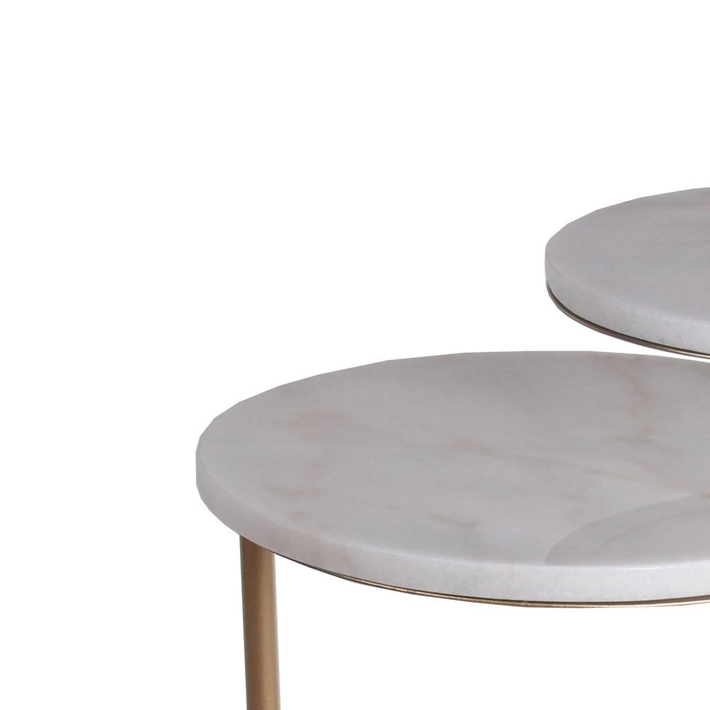 Benzara BM216943 2 Tier Round Marble Top Accent Table with Tubular Legs, White and Gold