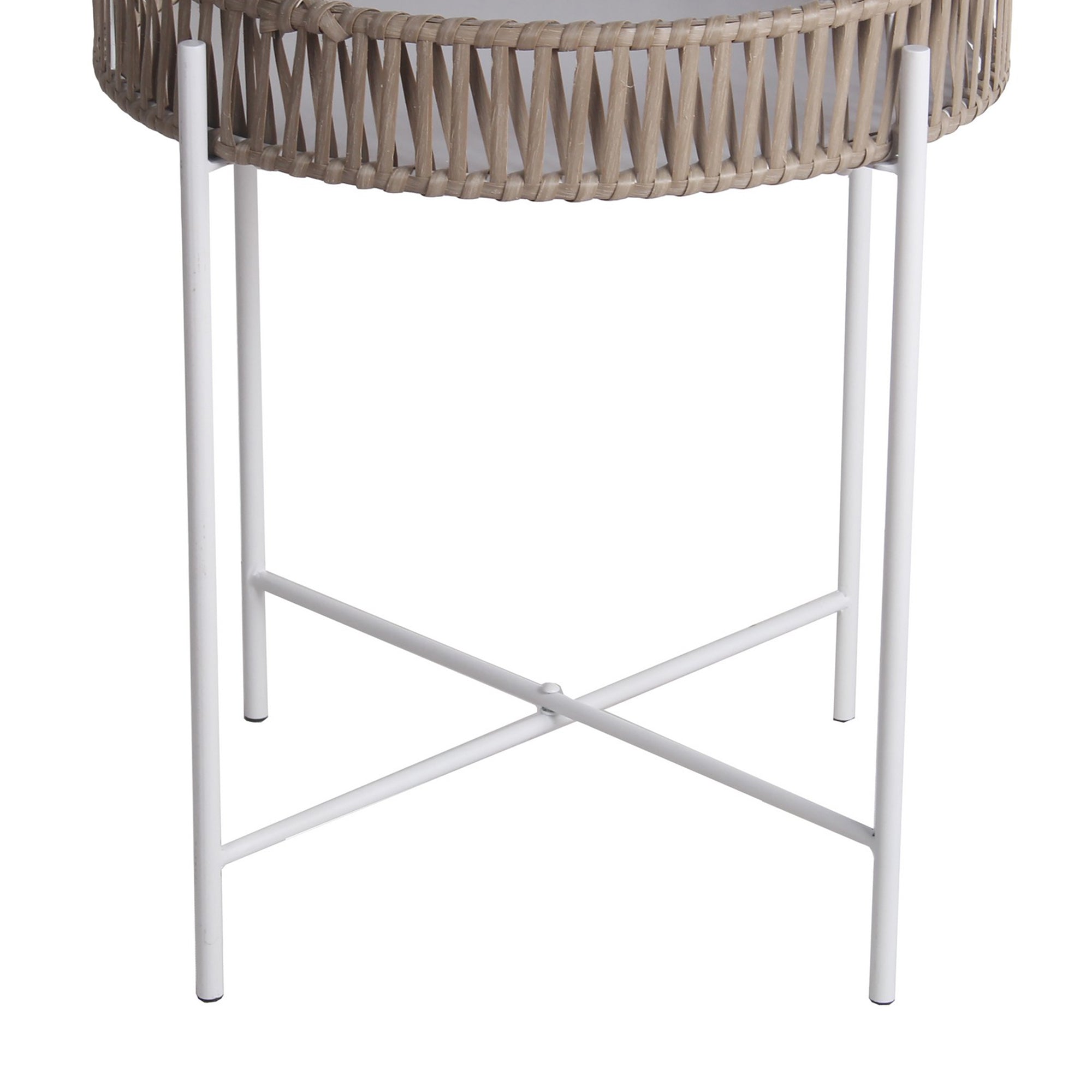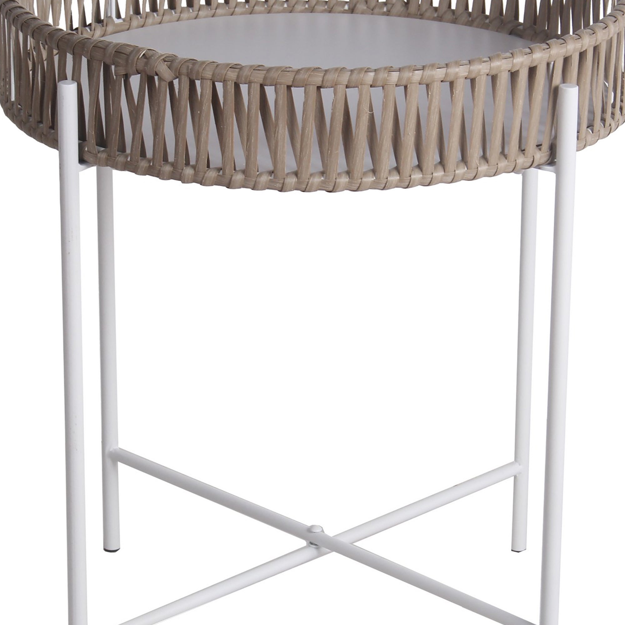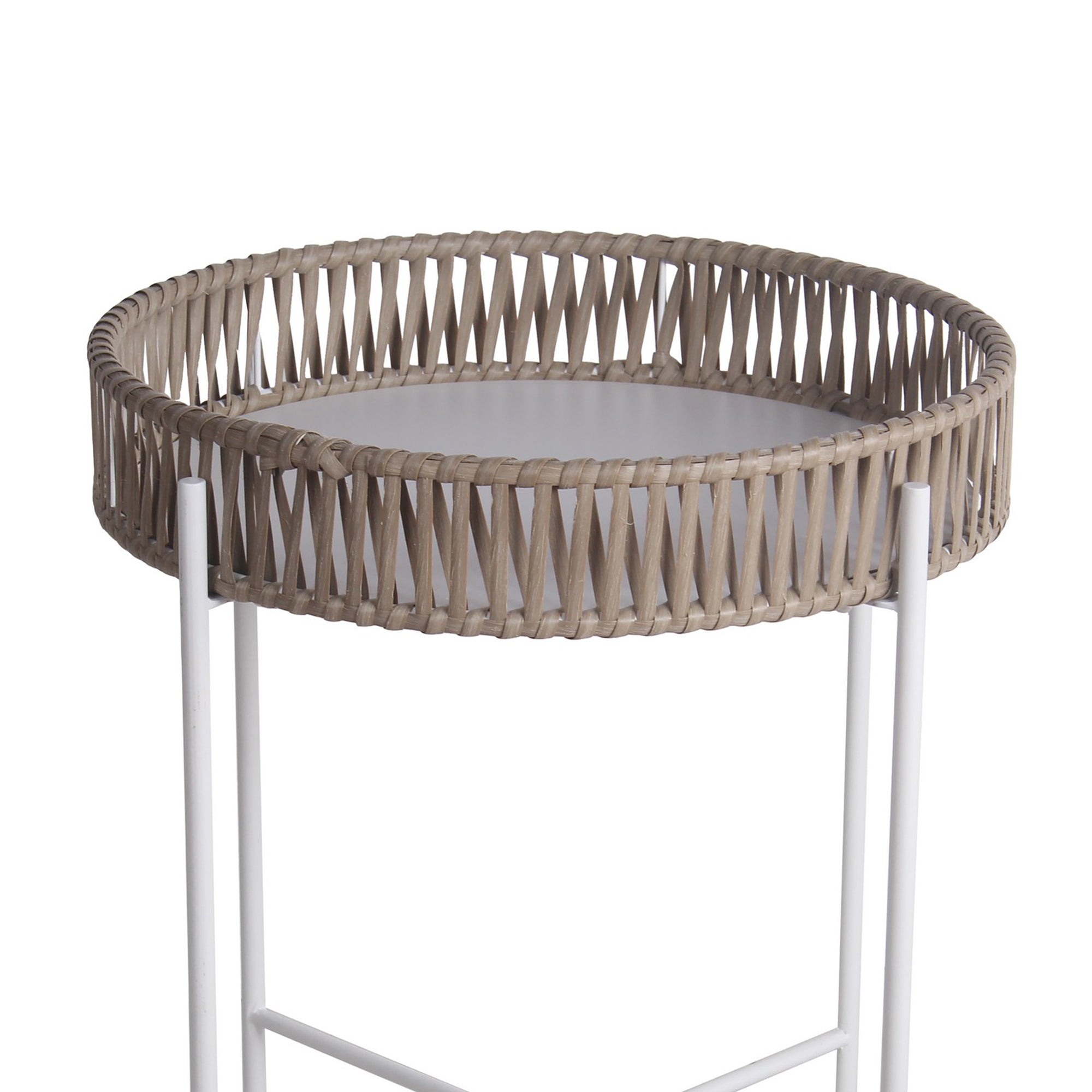 Benzara BM217048 Metal Accent Table with Round Top and Woven Edges, Small, White and Brown