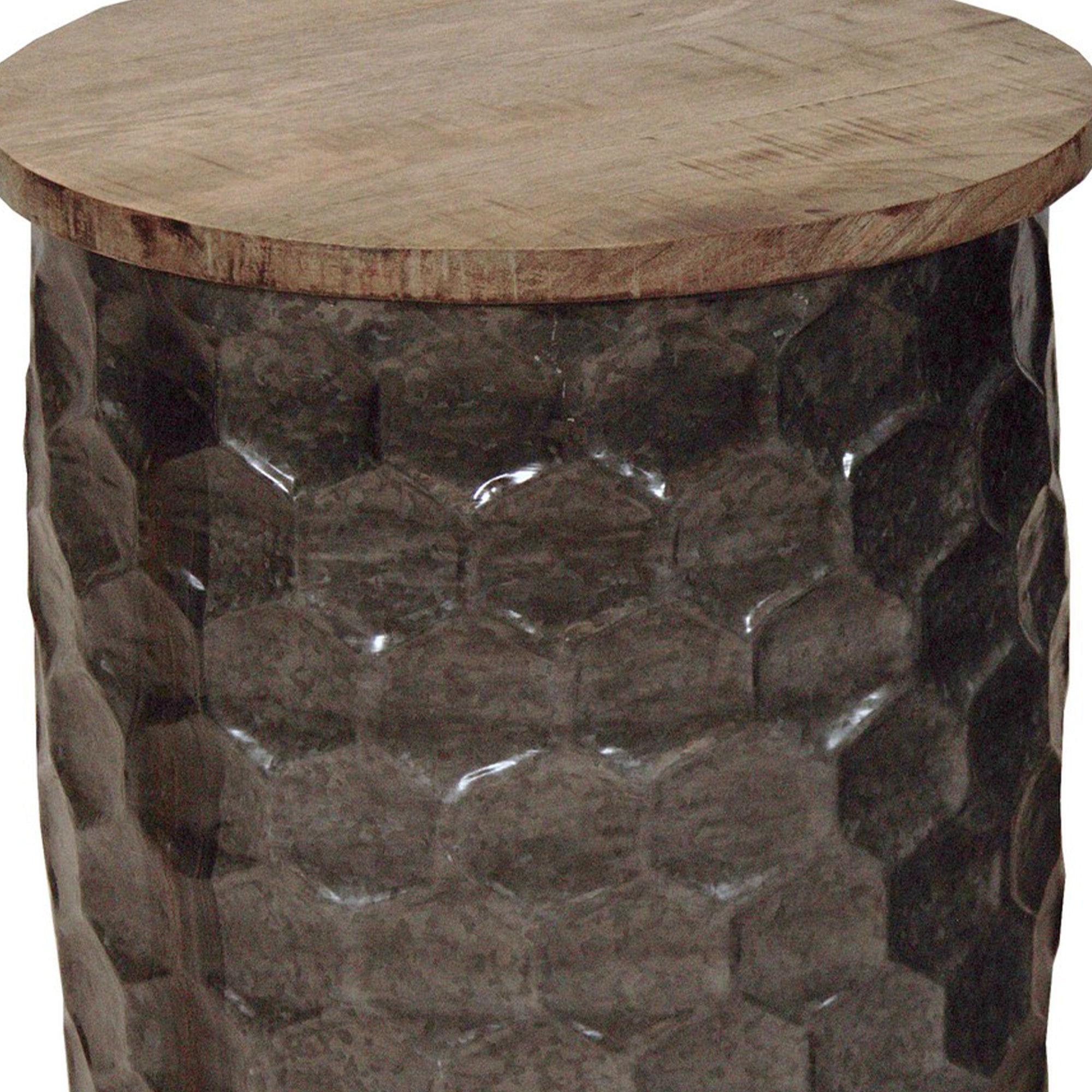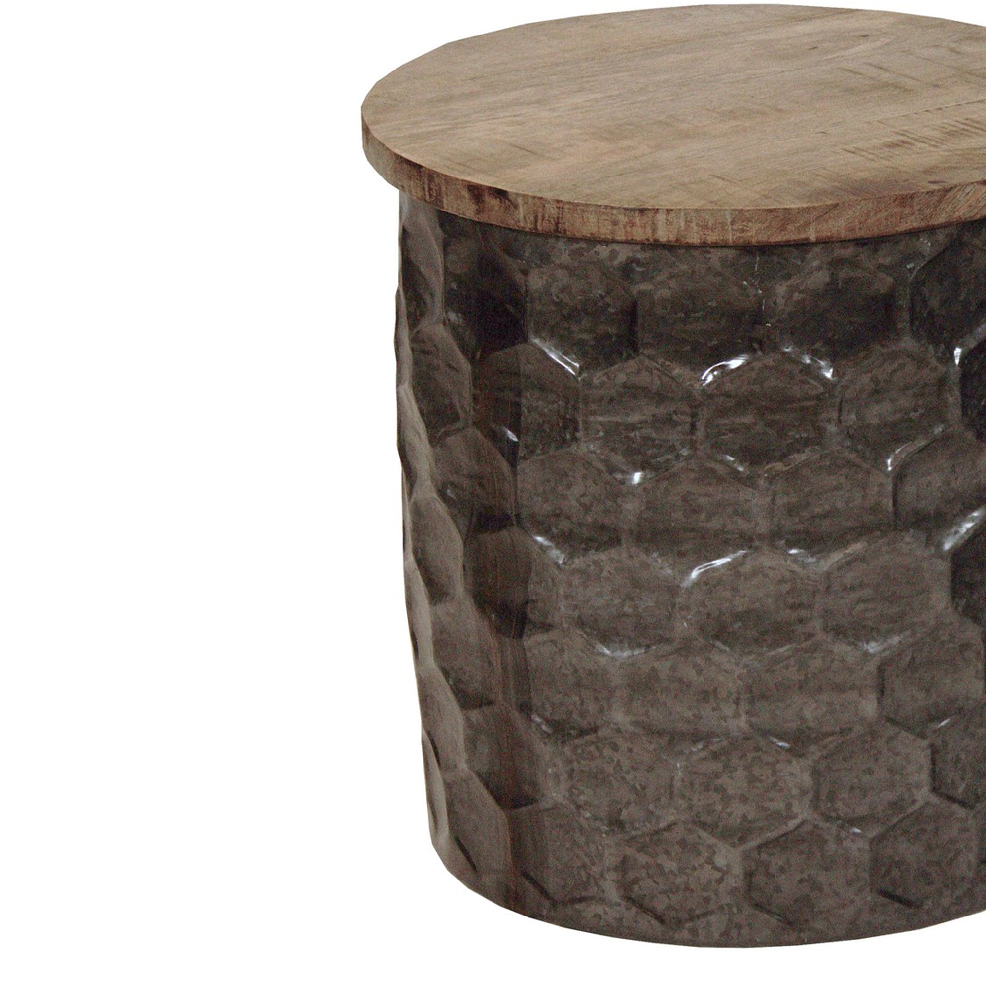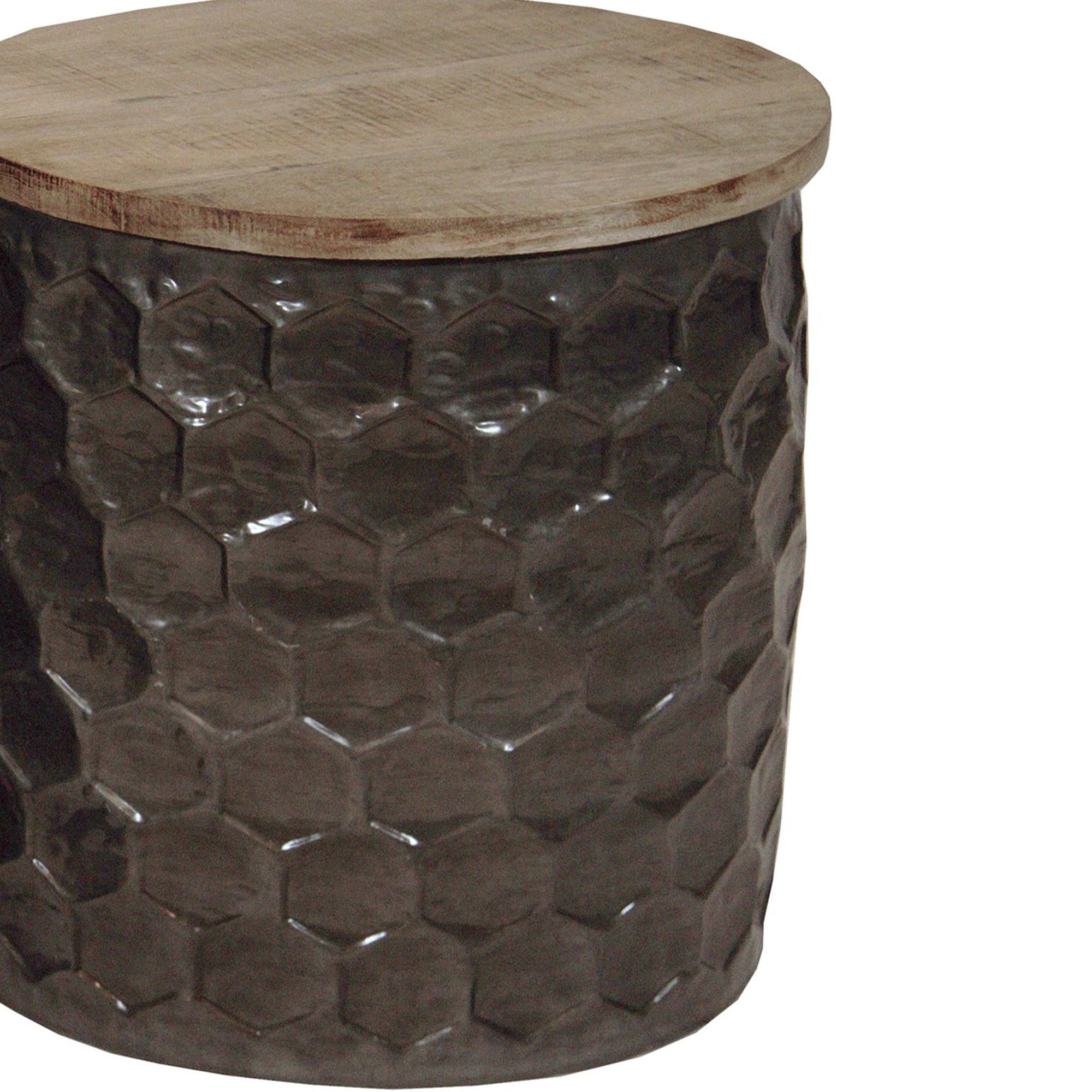 Benzara BM217066 Round Wooden Accent Table with Honeycomb Drum Metal Base, Set of 2, Brown