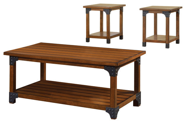 Squeeze in work between coffee breaks. A simple lift transforms the Alita from coffee table to laptop table. Great for those prone to bringing home work from the office. And for those who like to put their feet up and binge watch The Office. The elegant oak finish means it can sit pretty in your living room, letting you multitask. Simple yet detailed, this living room table group offers a plank style appearance to bring a rustic atmosphere to any setting. The antique dark oak finish is additionally complemented by metal corner accents. It comes in a set of three i.e. 1 coffee table and 2 end table.