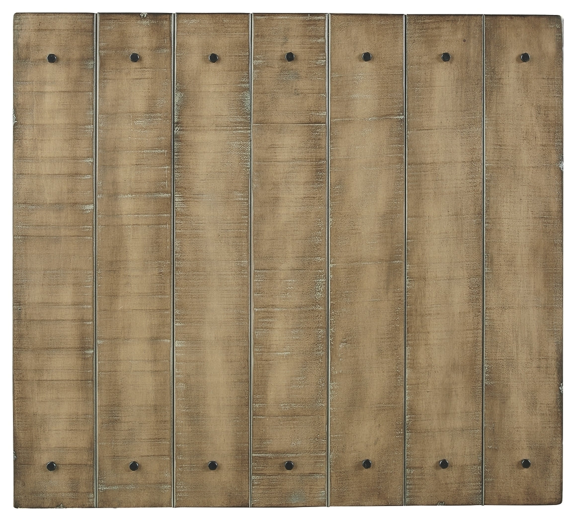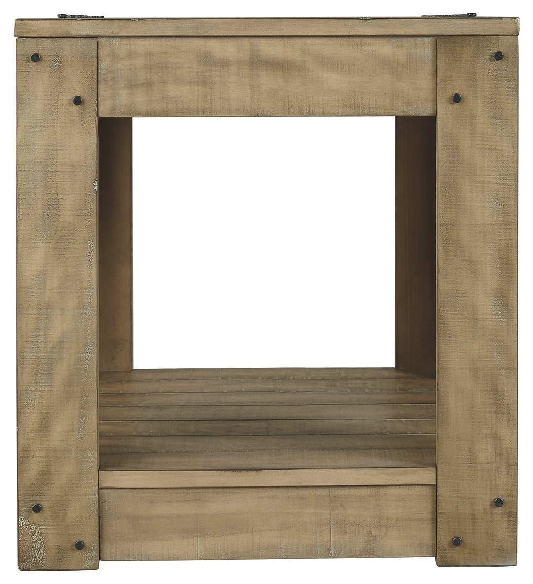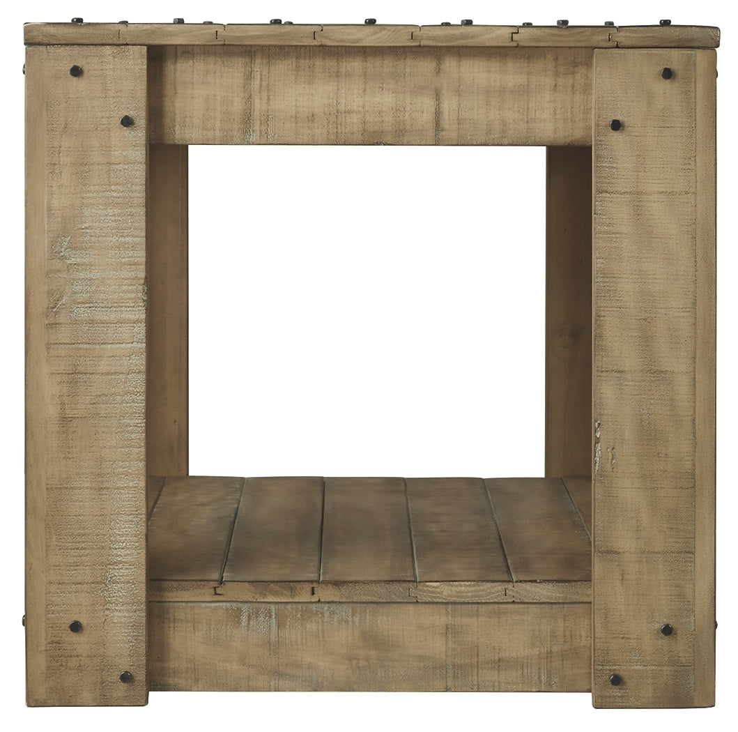 Showcasing clean and simple lines, this sturdy wooden constructed end table featuring rustic style is here to adorn your home. Rectangular plank design structure, it has 1 open bottom shelf which provides ample space. Weathered and natural finish adds to the look. Nail accents across the edges enhances the look.