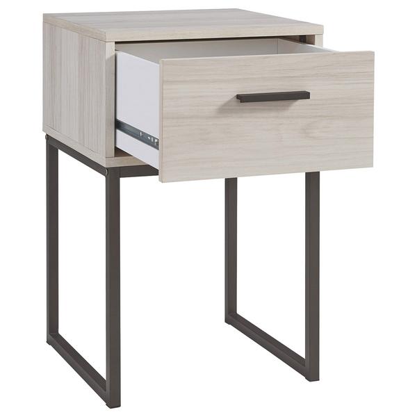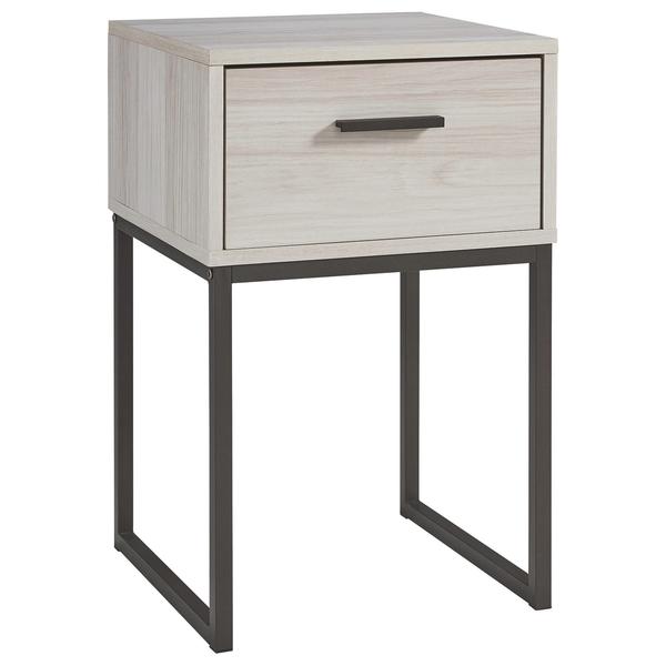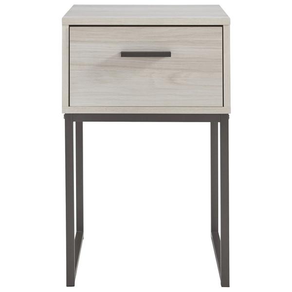 Accentuate your existing decor setting by bringing in this transitional style Nightstand which comes with 1 smooth gliding drawer and showcases grain details. Constructed from engineered wood, laminate and metal frame, it is accented with antique white and gray finish.