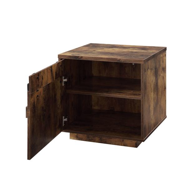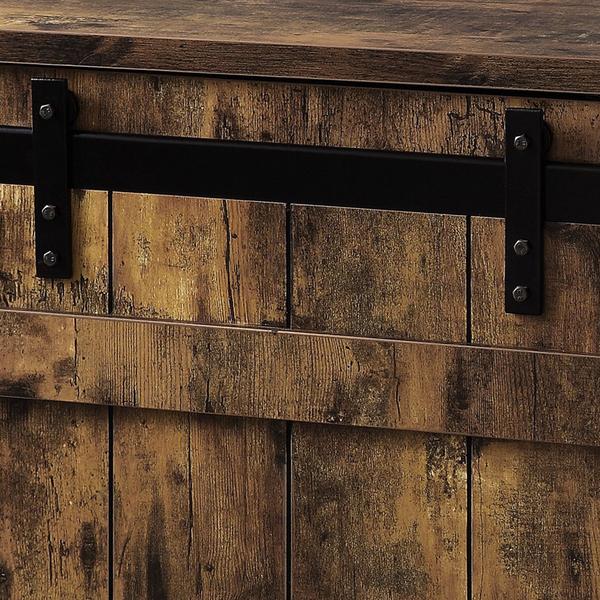 Provide great storage and rustic style for your living space by bringing this End Table. This showcases a barn door that glides and exposes a maximum storage and accessibility ease. Metal hardware accents have a unique look to continue the antique theme, supported on a floating plinth base. Top it with a small abstract figurine for an artful and eye catching display.