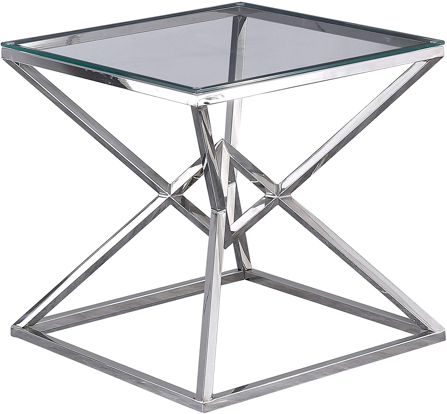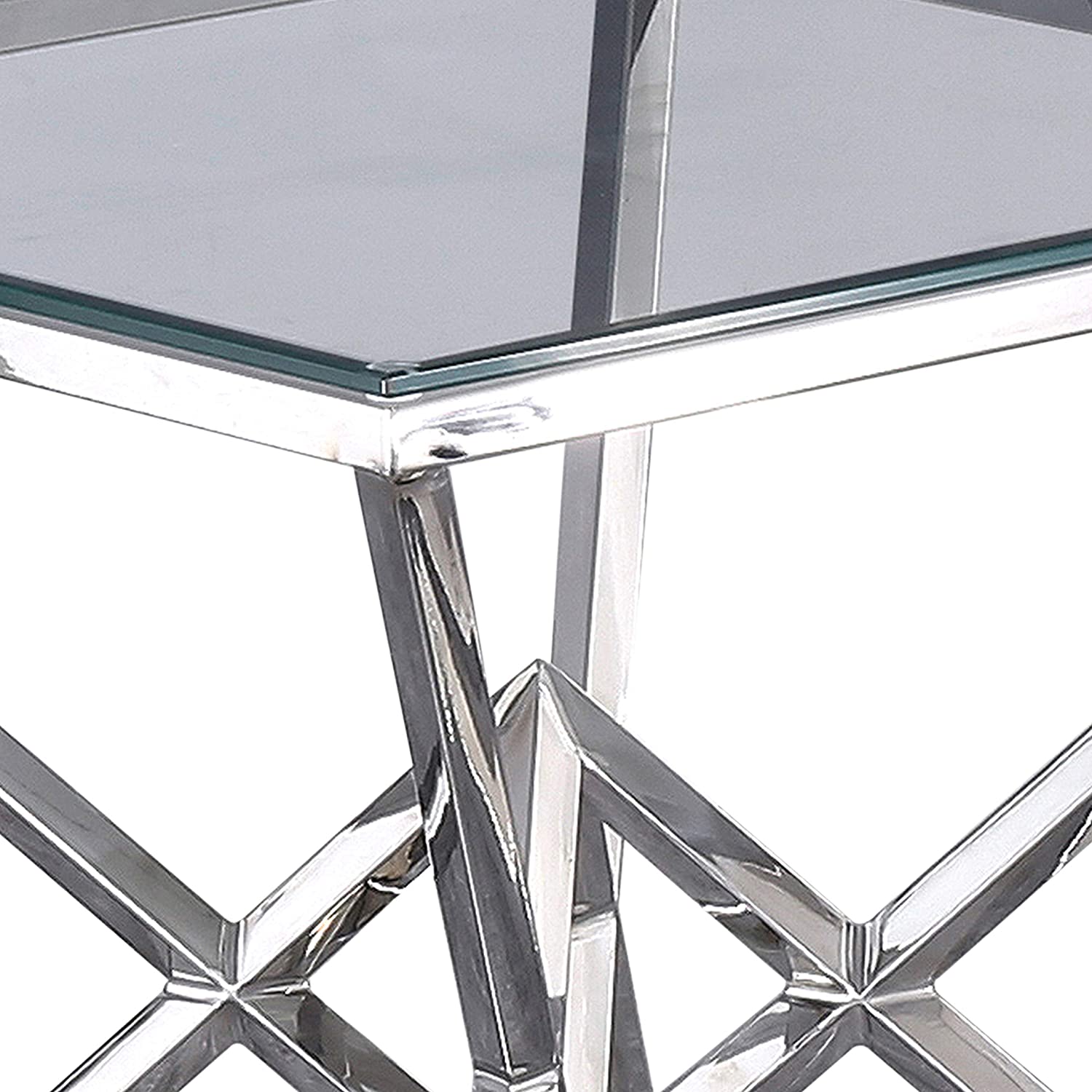 Benzara Square Glass Top Metal Side Table with Open Geometric Base, Silver