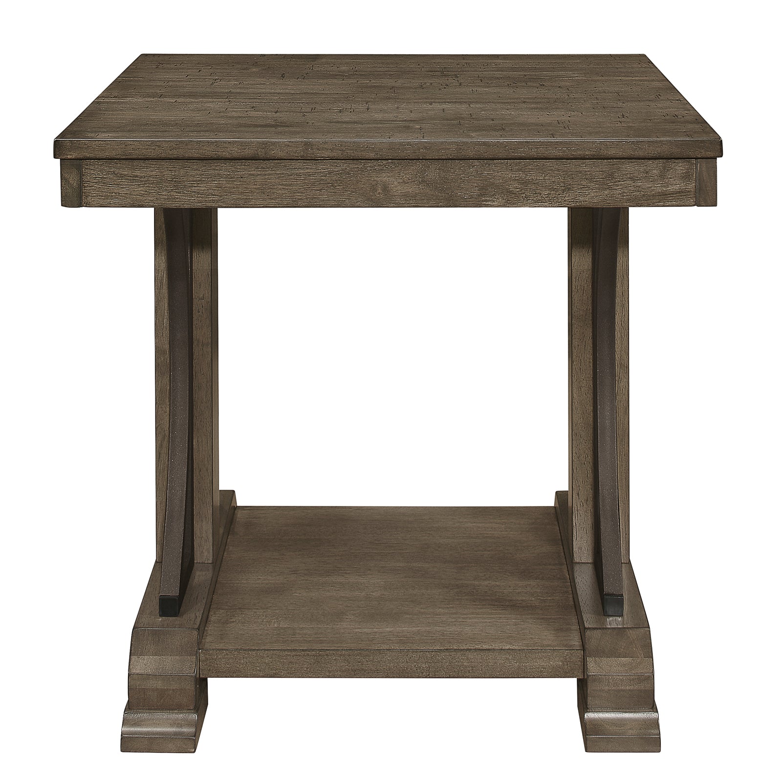 Create a modern industrial or rustic setting fit for entertaining in your living room with this End Table. Constructed from a mix of wood and metal materials, this table features unique support legs that resemble an hourglass shape. Beneath the square top is an open shelf that provides additional display space.