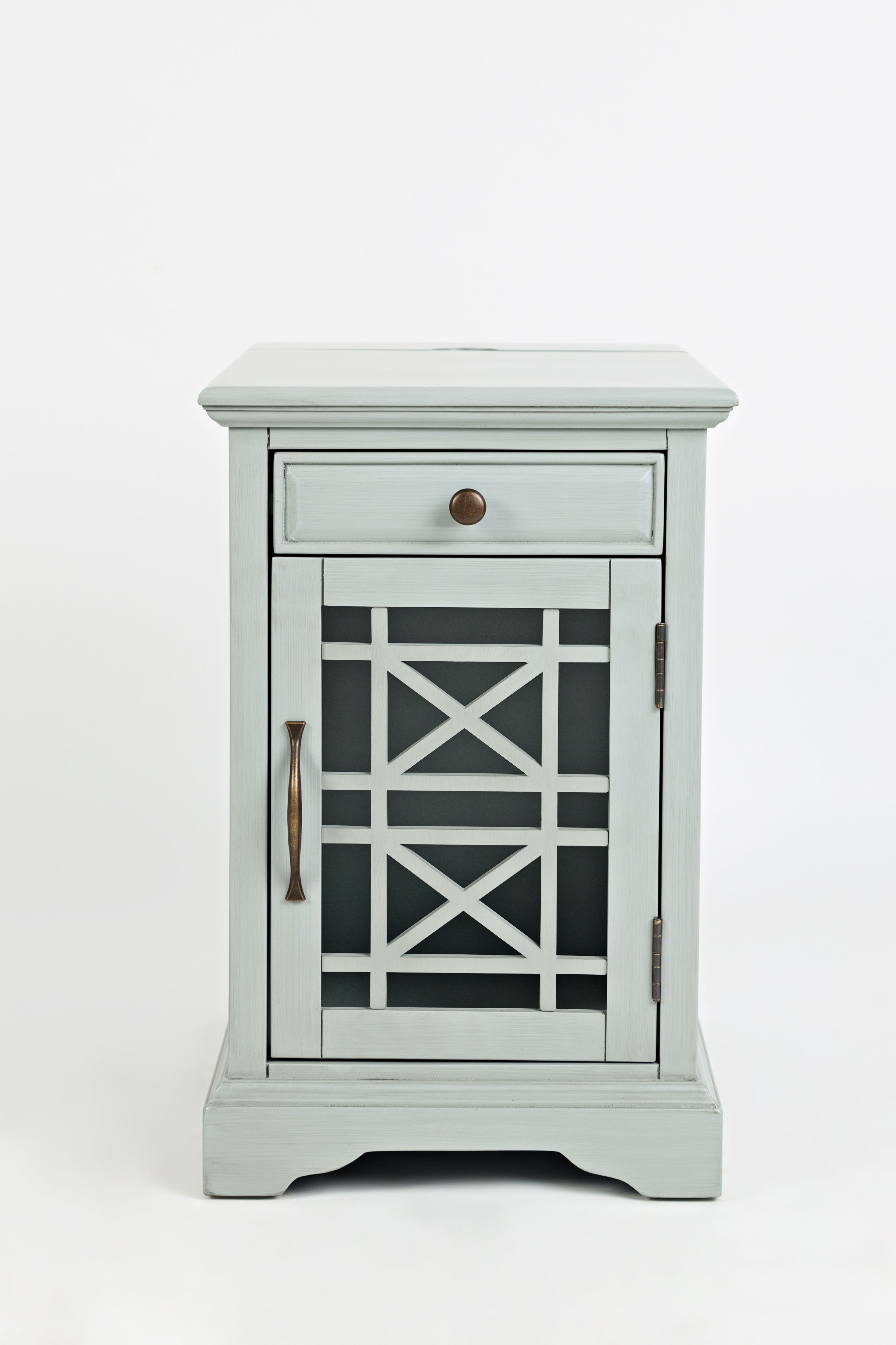 This chairside table is a useful yet beautiful addition for home. Incredibly designed with a earl gray(light gray) finish, this cabinet has one door and one drawer for easy storage space. Both drawer and door has antique hardware that makes it a real treasure and it also have a hidden charger space. Now charge your tablet or plug-in a table lamp without have a tangle of cords. Its beveled cabinet top features ``X`` motif detailing over the glass doors and its power unit has two outlets and two USB ports. Drawer Dimension: 9.75``W x 11.25``D x 2.25``H. Cabinet Opening: 12``W x 15.5``H. Area Dimension Behind Door: 12``W x 19.5``D x 15.5``H. Top Surface Area Without Flip-top: 16``W x 17.5``D.
