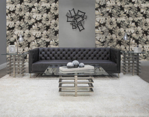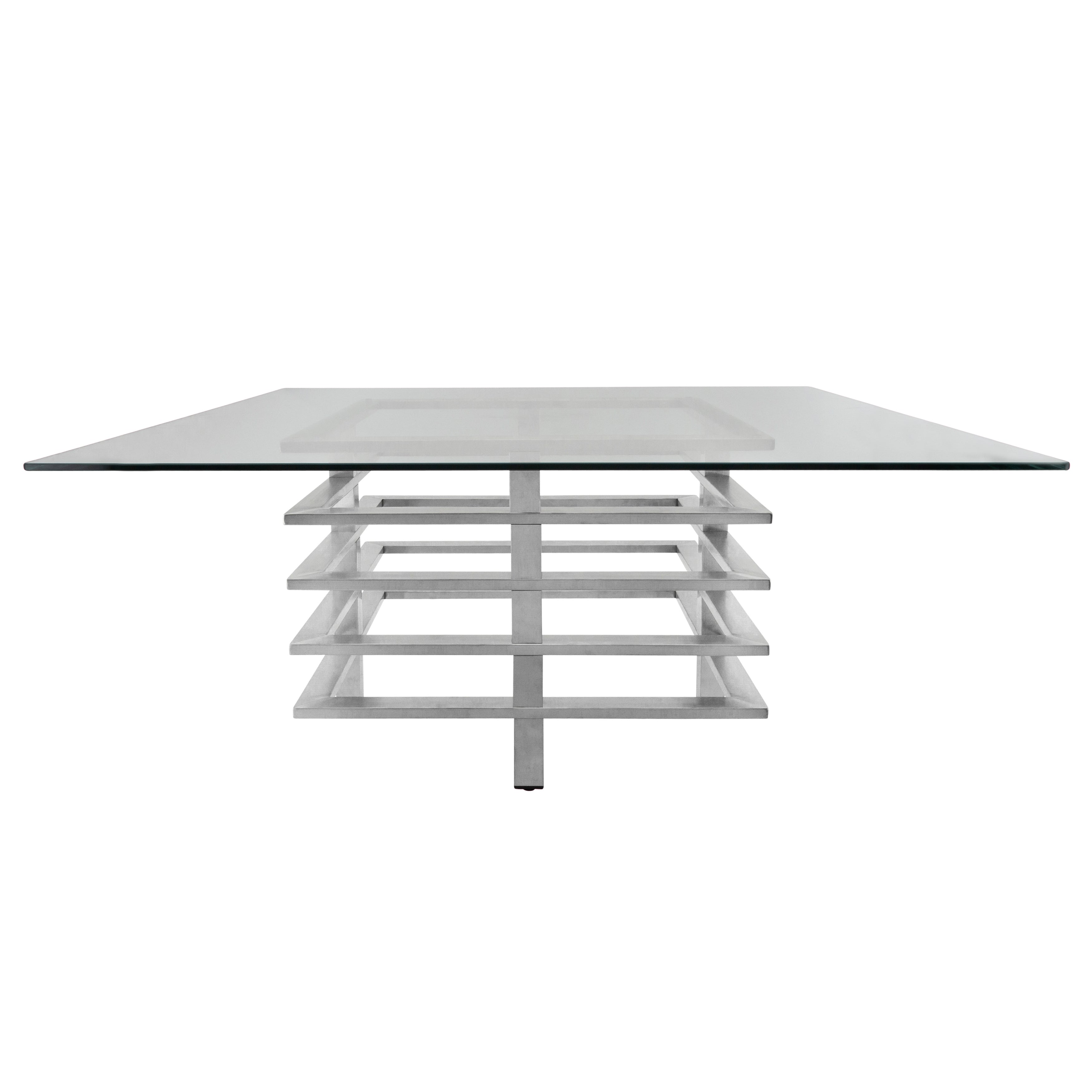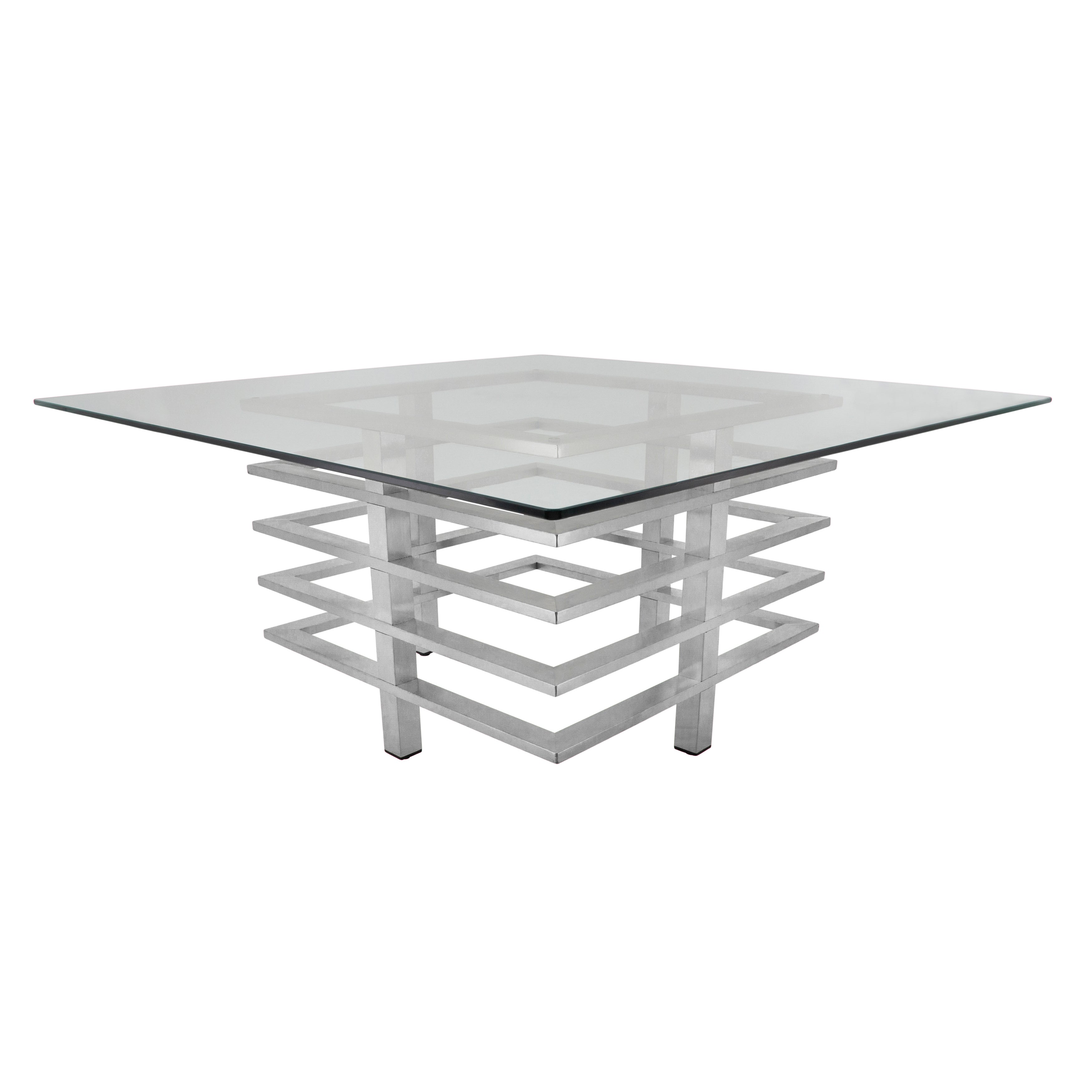 Modernize your home with this geometric style coffee table. With a stunning silver base to create a glamorous focal point in your home and a glass table top for an open view. This table will give your space a useful sophistication.