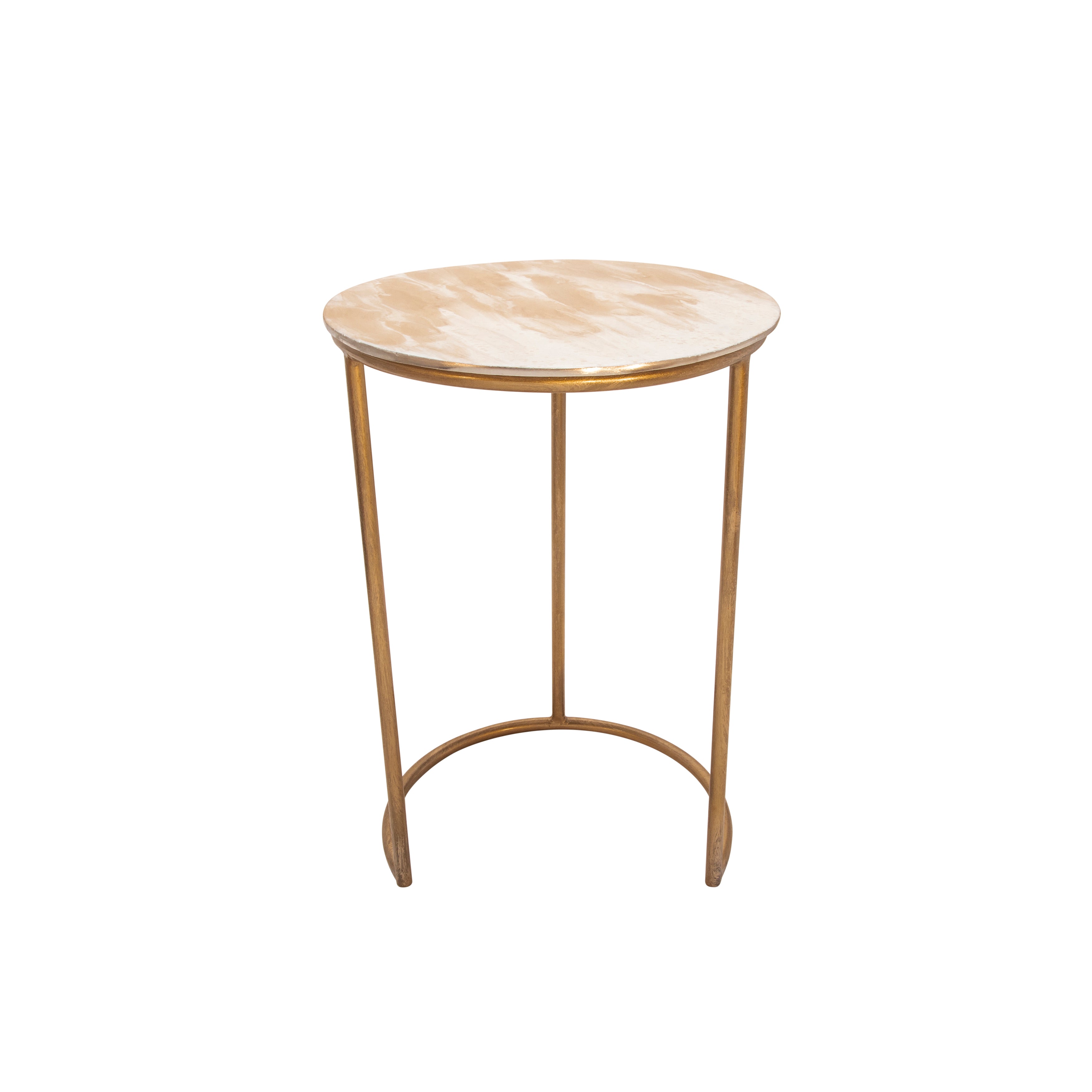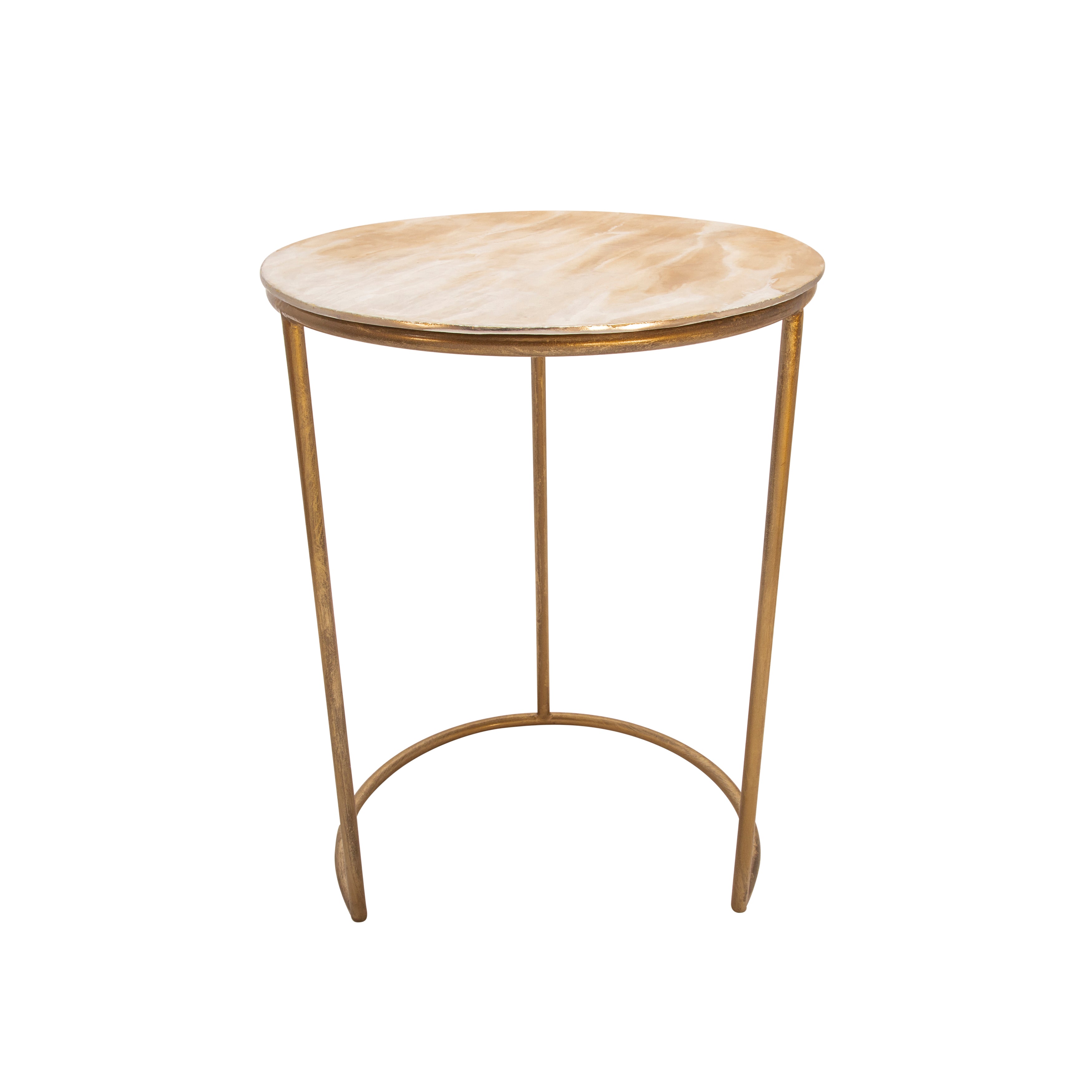 Cream colored tables top, inspired by abstract painting and warm colors. This set of 2 nesting tables come with a sturdy golden base that will beautifully compliment any glamorous decor. With a marbles tables top for added elegance.