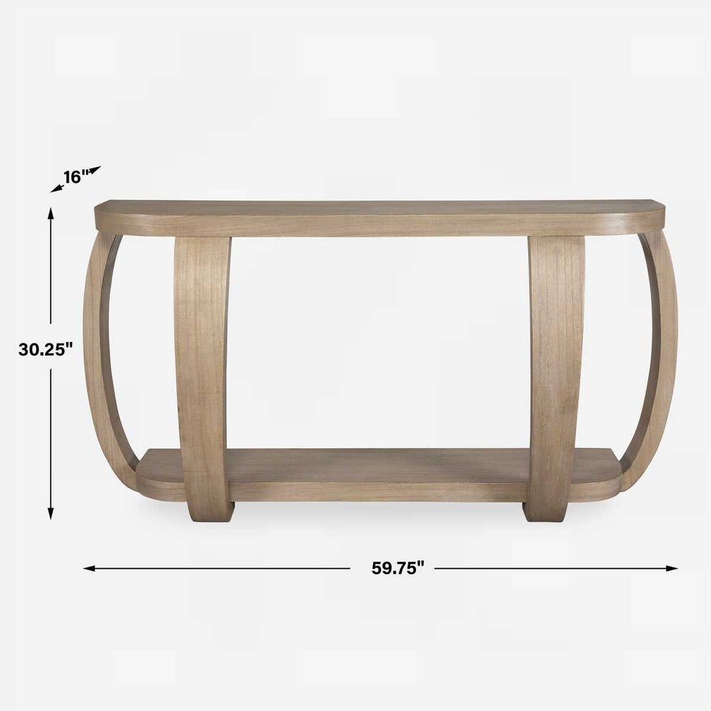 This Console Table Features A Beautiful Natural Mindi Wood Finish That Highlights The Organic Grain And Texture Of The Wood. The Design Boasts Of A Gracefully Curved Base With An Open Frame, Giving It Airy Contemporary Feel.