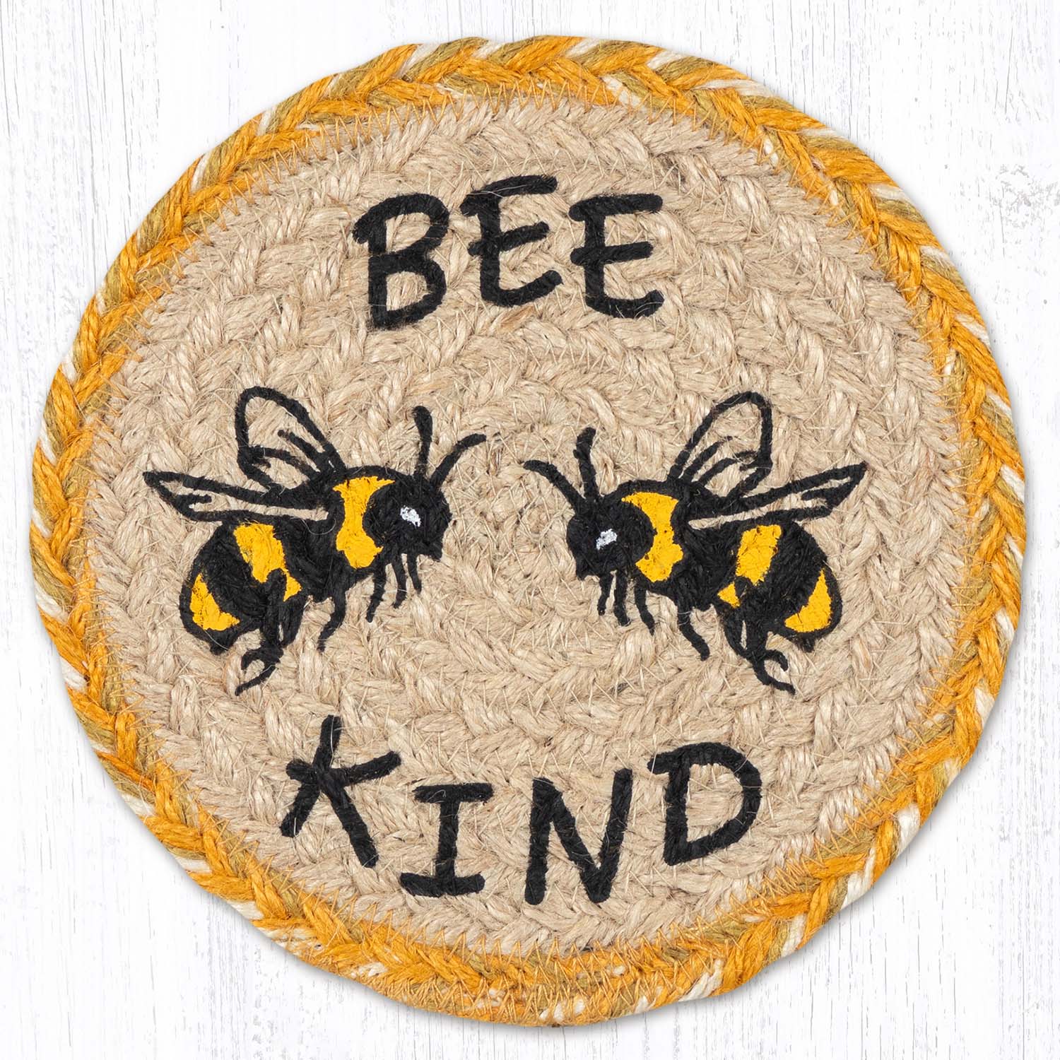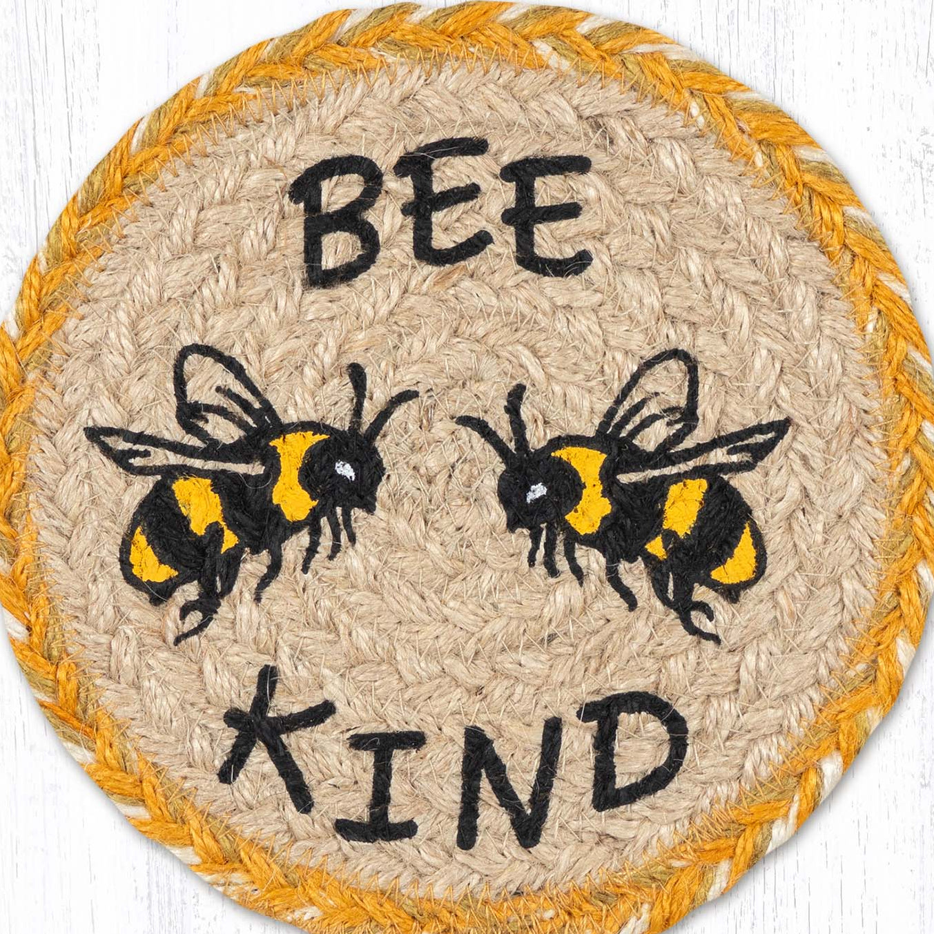 Bee Kind Large Coaster – 7" x 7" Round Braided Jute Hand-Stenciled Coaster By Earth Rugs
