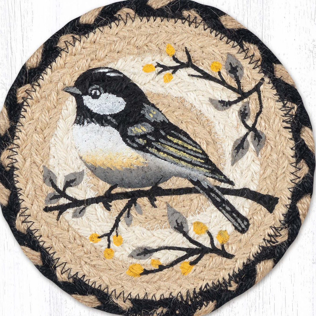 SKU - ER79-121CSChickadee Spring Large Coaster – 7" x 7" Round Braided Jute Hand-Stenciled Coaster