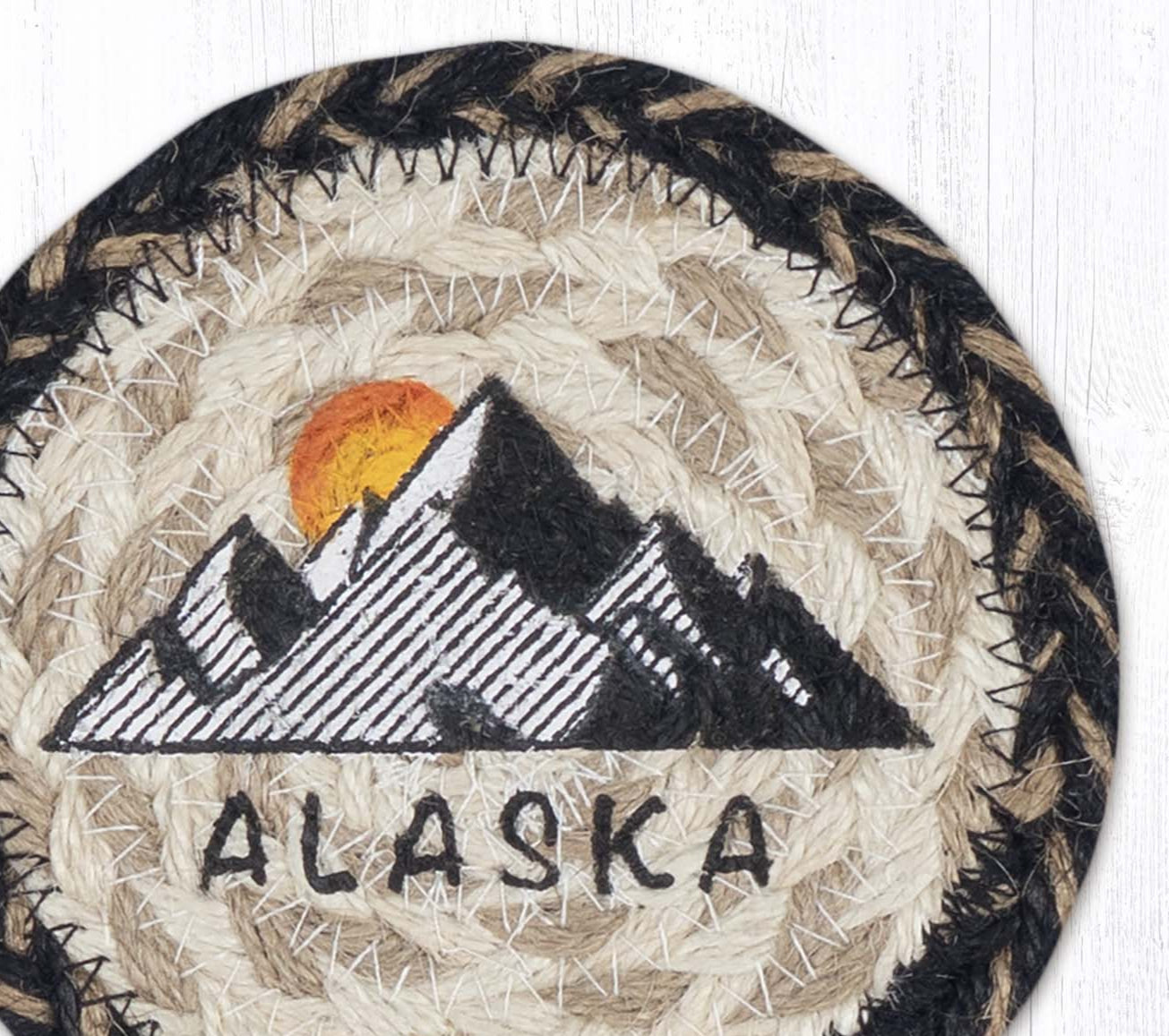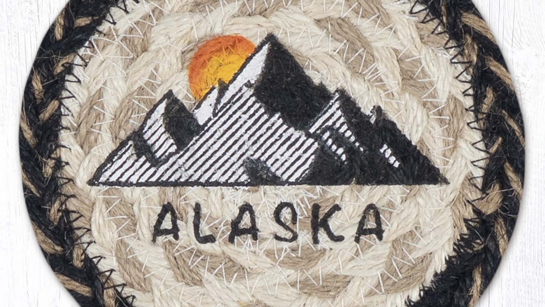 Celebrate the spirit of the Last Frontier with the Earth Rugs Alaska Printed Coaster, designed from 100% hand-braided natural jute. Measuring 5"x5", this round coaster features a printed Alaska-inspired scene, typically showcasing majestic mountains, evergreen forests, or native wildlife imagery. The earthy braided border complements the vivid printed center, creating a durable and decorative piece ideal for rustic, cabin, or adventure-themed interiors. Flat and compact, it fits effortlessly on end tables, desks, or kitchen counters, adding both function and northern charm to any setting.
