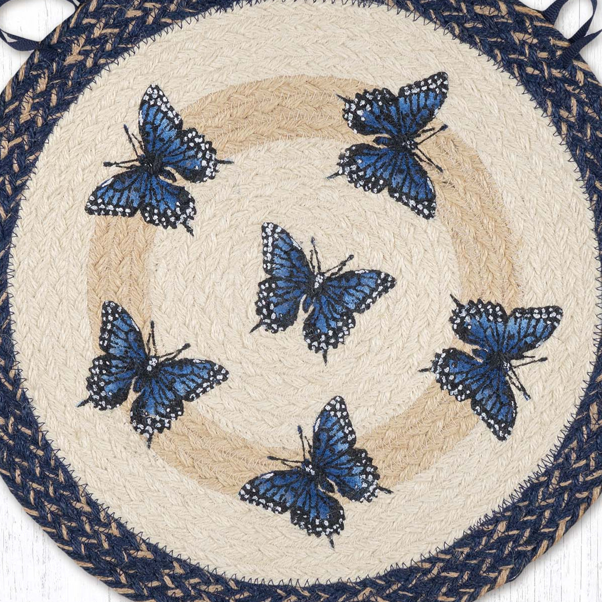 SKU - ER49-CH9-921BSBlue Swallowtail Round Braided Jute Chair Pad – Handcrafted Butterfly Accent 15.5" × 15.5"