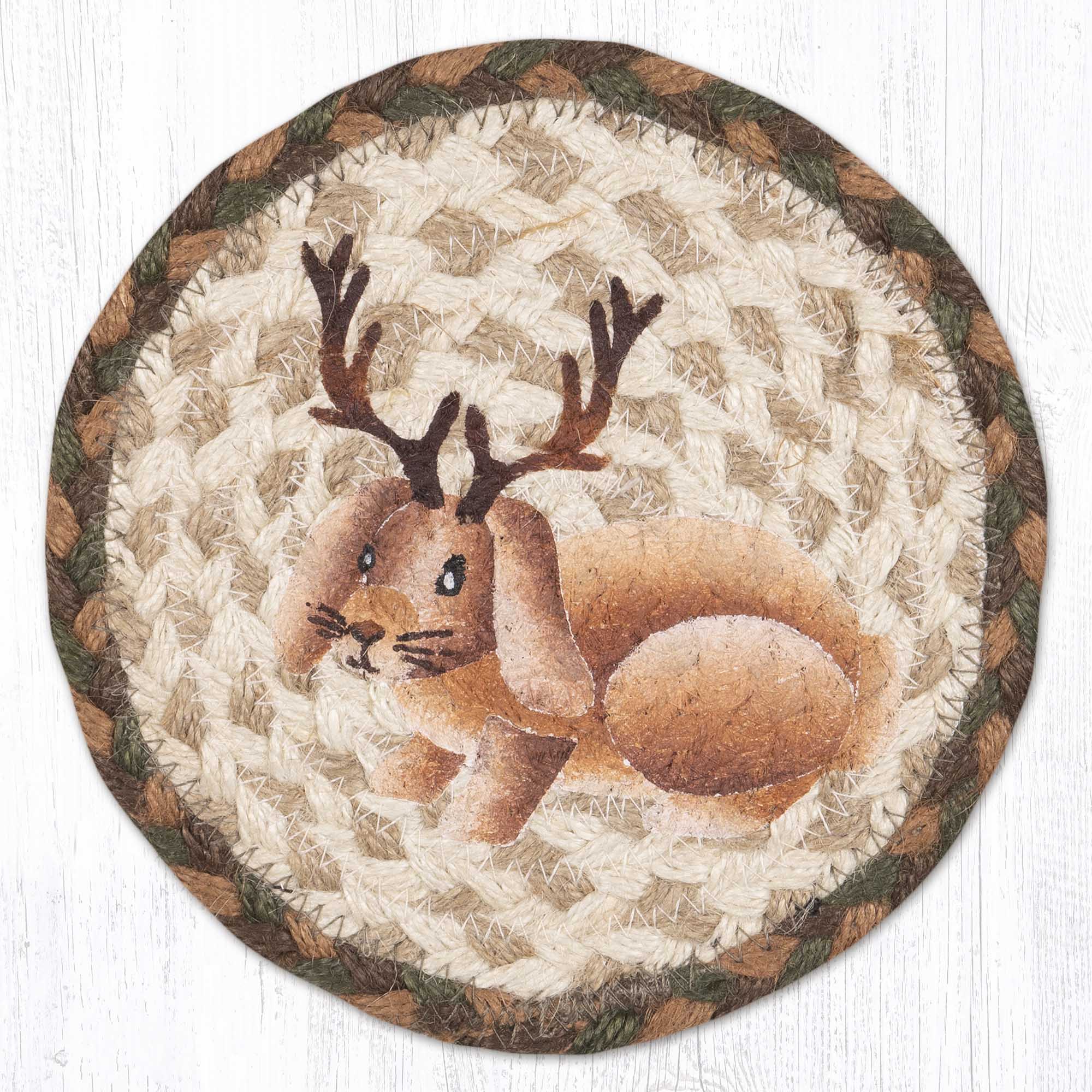 braided jute coaster,decorative jackalope coaster,Earth Rugs jackalope coaster,eco-friendly jackalope table mat,farmhouse jackalope round coaster,farmhouse wildlife décor,jackalope coaster,large 7x7 jackalope round coaster,rustic country coaster,rustic wildlife coaster,rustic wildlife table accent,wildlife round drink mat