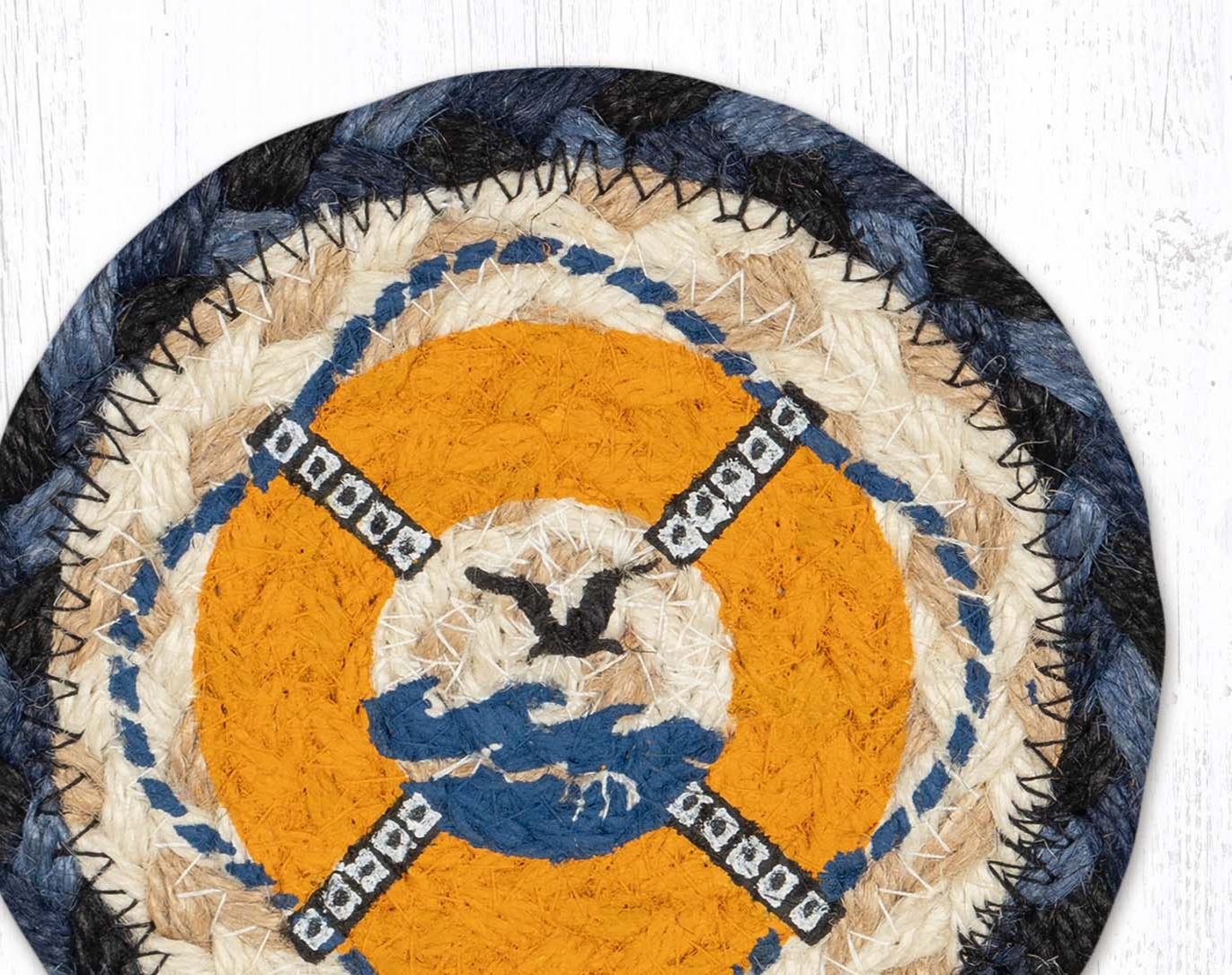 SKU - ER31-IC443NLNautical Lifebuoy Printed Coaster – 5"x5" Jute Square, Coastal Red & Navy Decor Table Accent