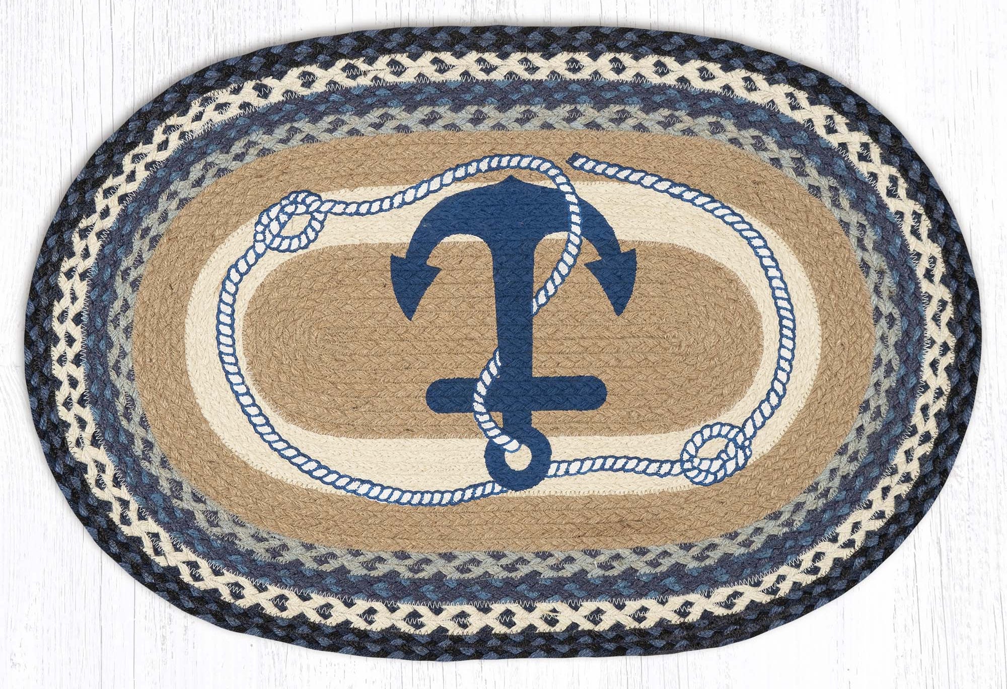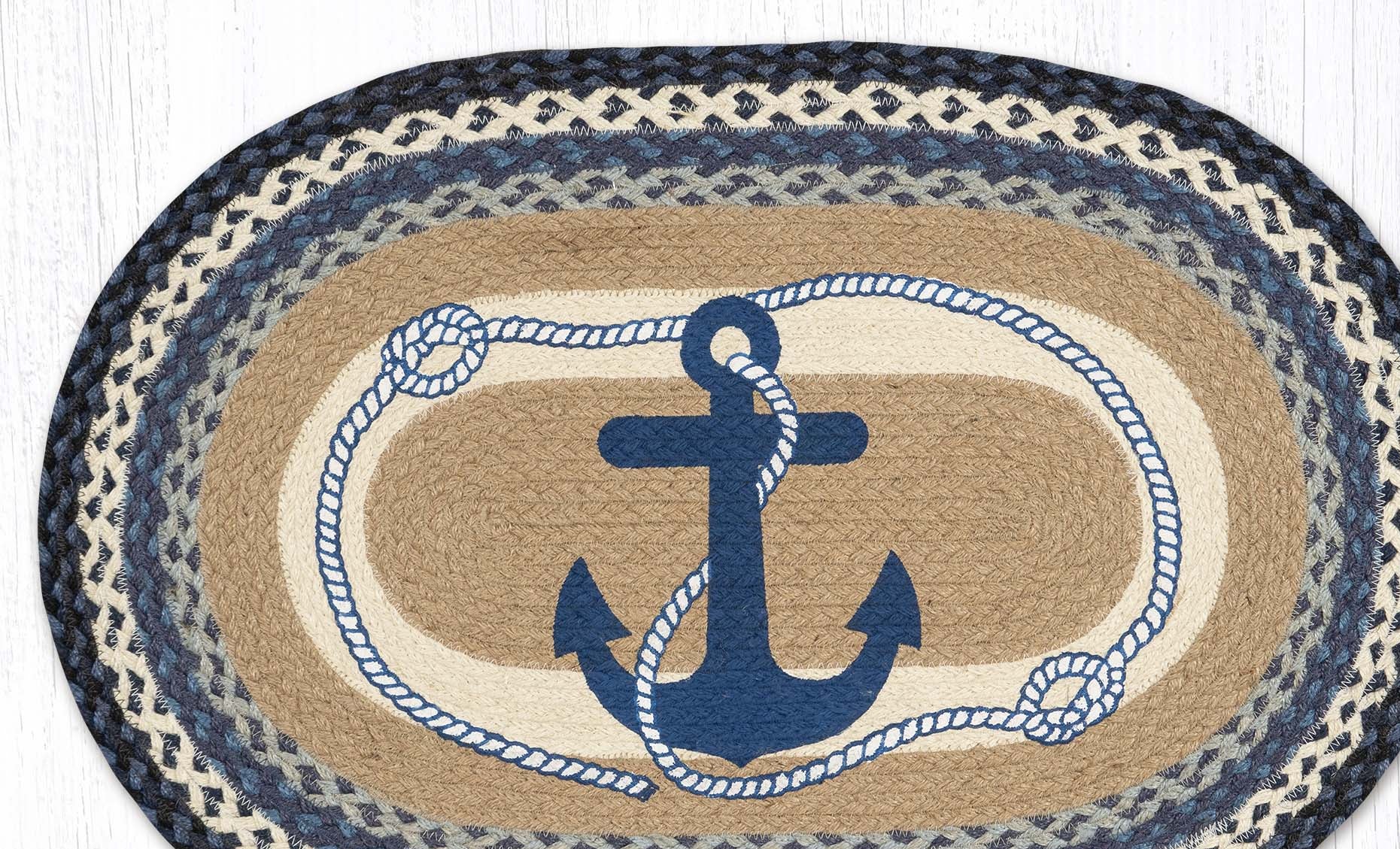 Earth Rugs Oval Patch Tread – Navy Anchor Design in Braided Jute, 20"x30" Nautical Entryway Rug for Coastal Decor