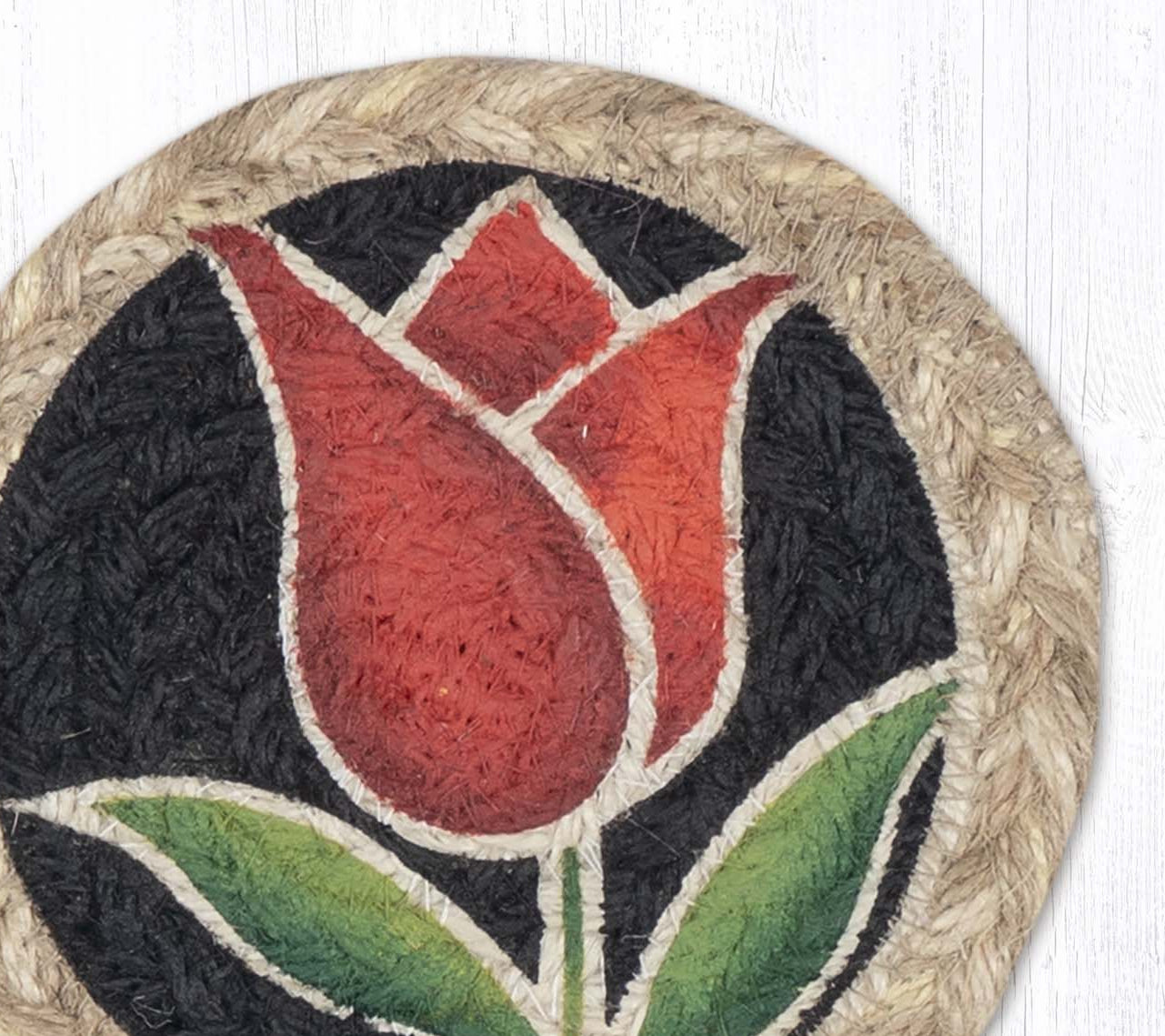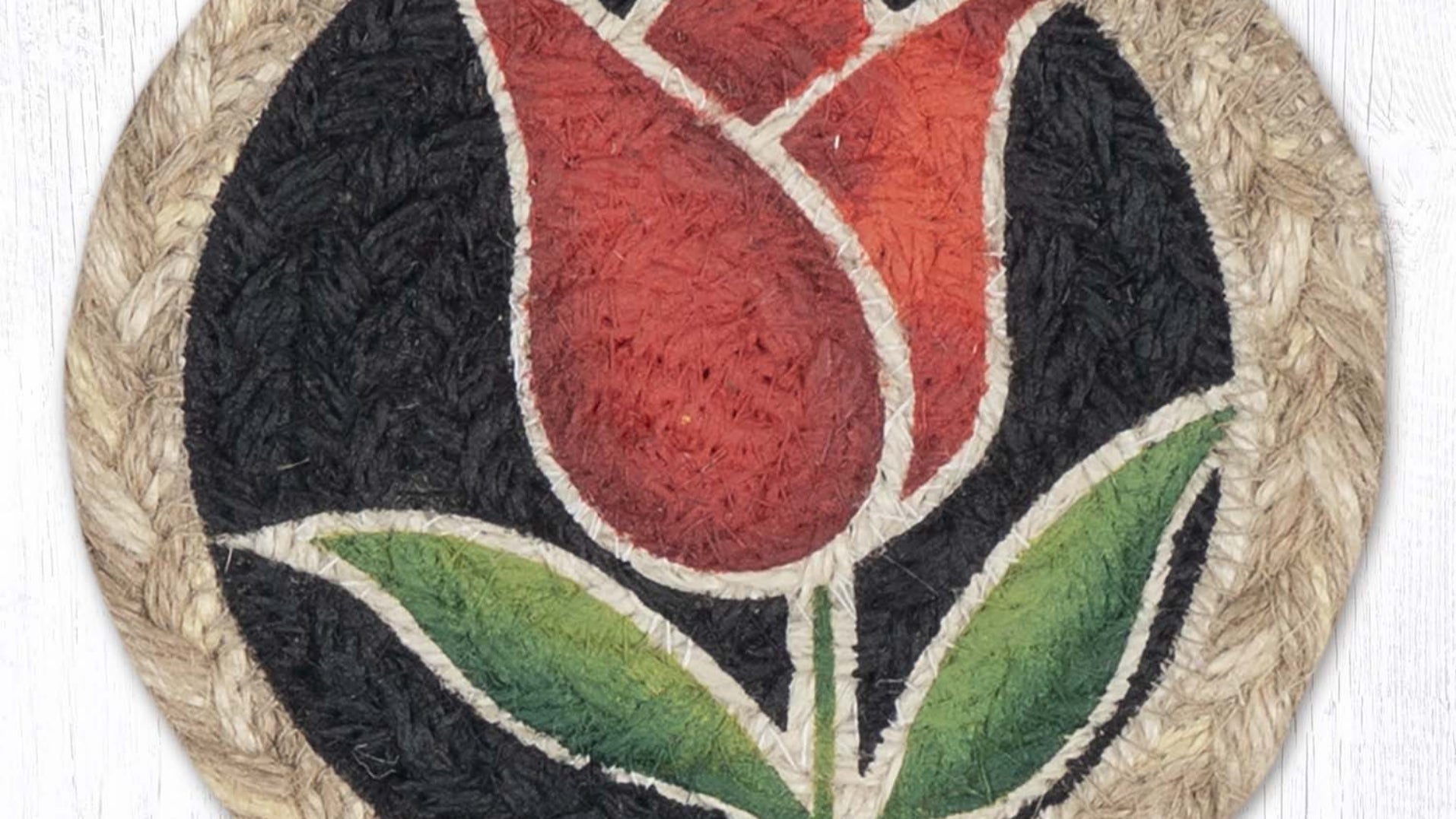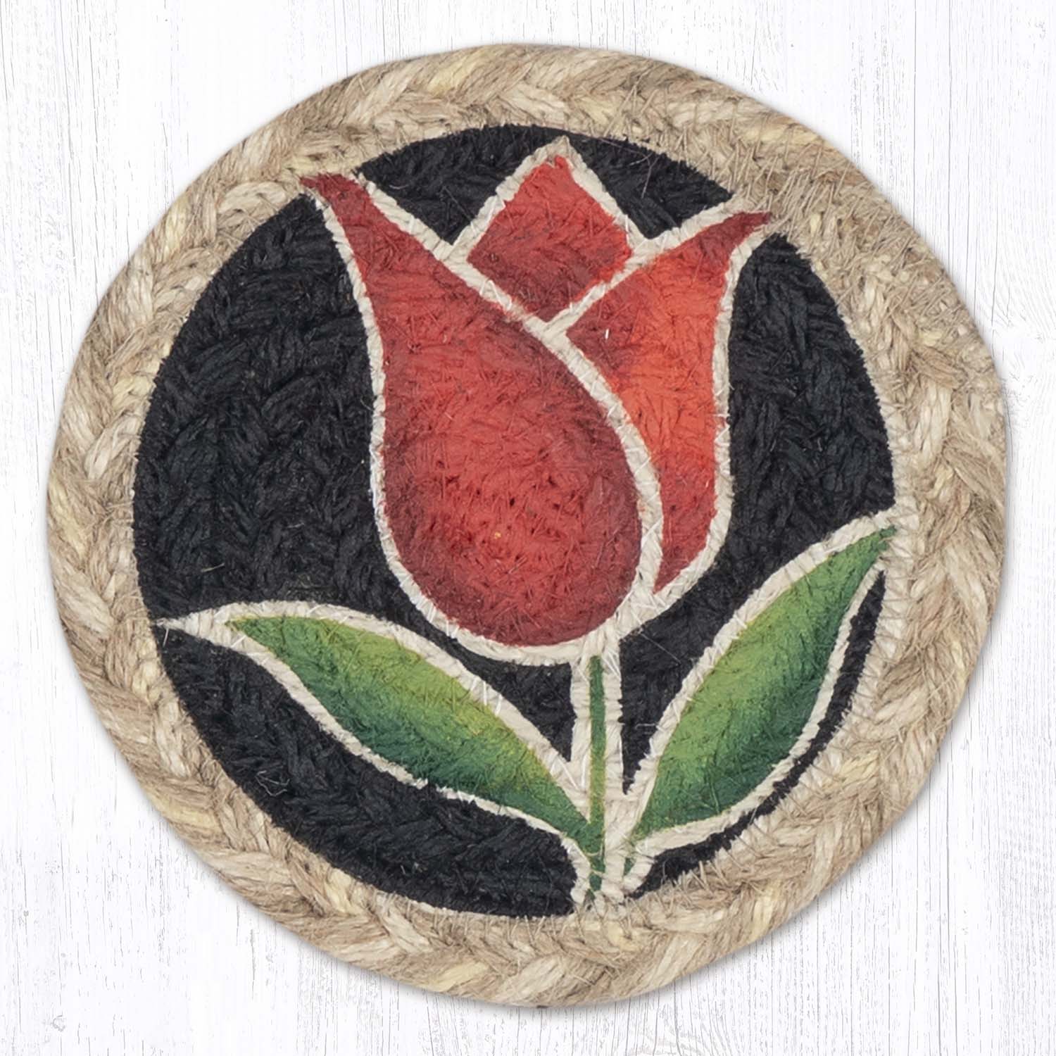 Earth Rugs Red Tulip Jute Coaster – 5"x5" Round Braided Natural Jute Floral Coaster for Rustic Spring Decor