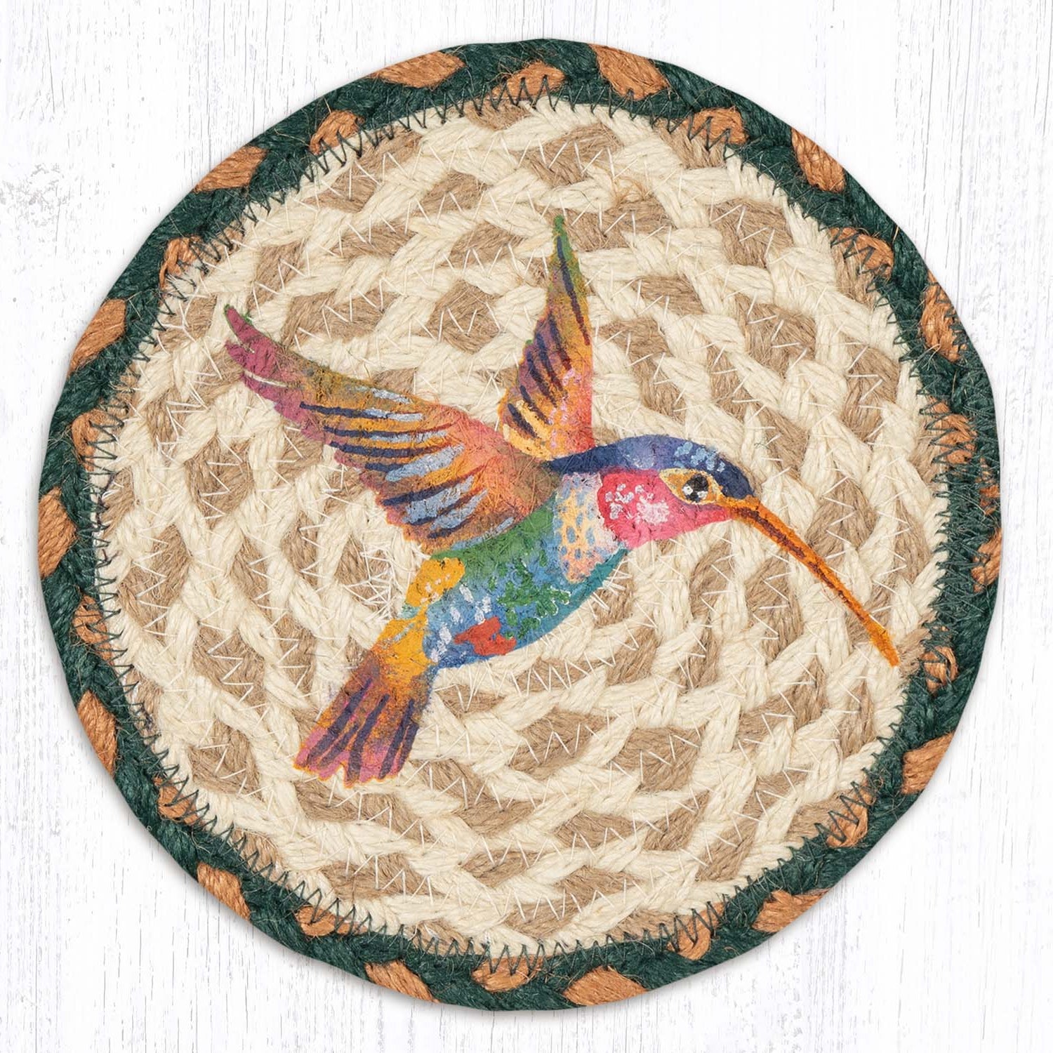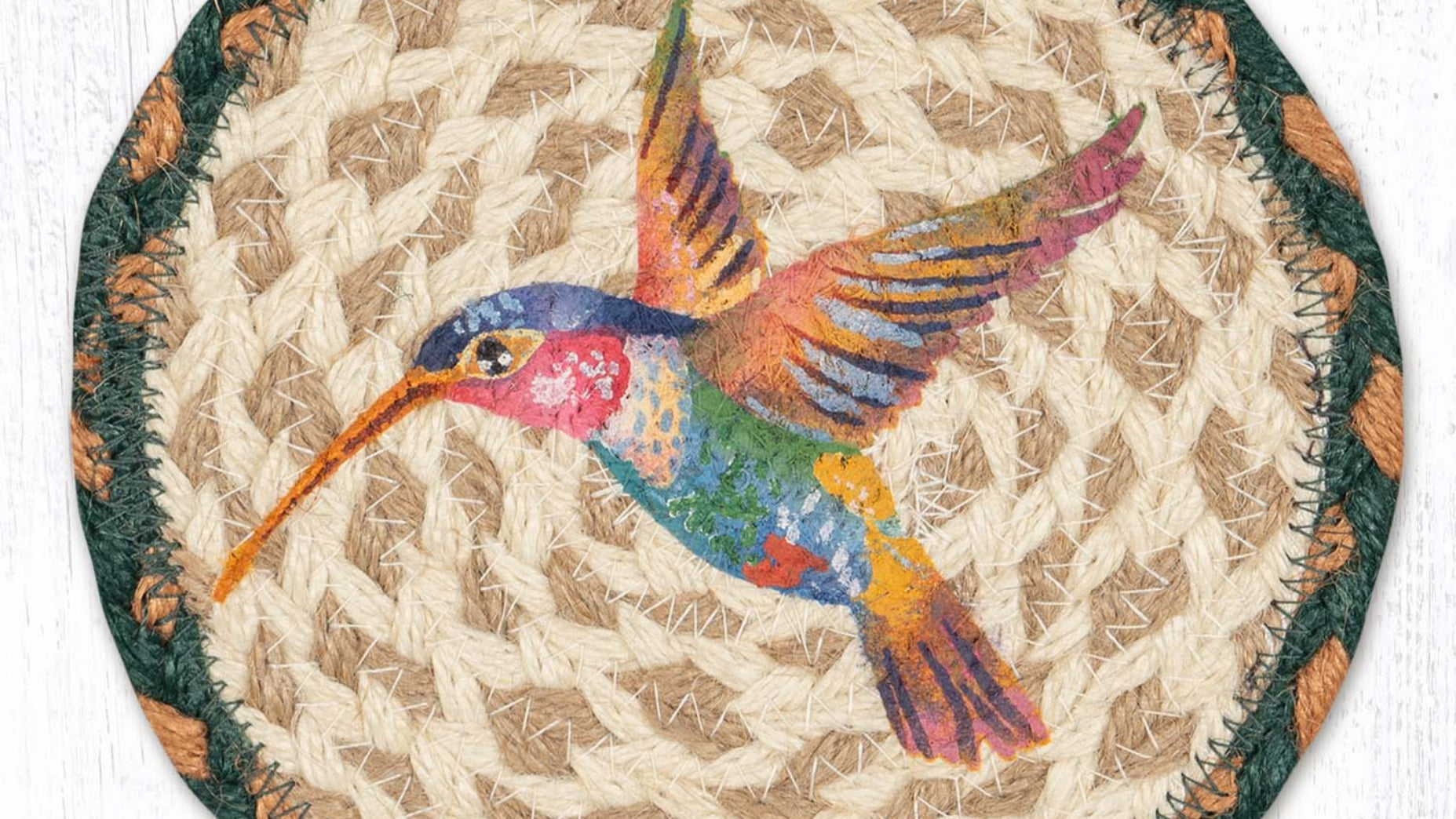 Bring a touch of natural elegance to your tabletop with the Earth Rugs Round Ruby Throated Hummingbird Coaster, a delicate yet durable accent featuring a vibrant hummingbird in flight. Hand-stenciled on eco-friendly braided jute, this 7-inch round coaster captures the grace of nature with pastel greens, soft blues, and a pop of ruby red. Perfect for cottage, garden, or shabby chic décor, its handcrafted design doubles as functional protection for mugs, candles, or small plates. The 7" x 7" size and soft braided edges add rustic charm to any room or seasonal setting.