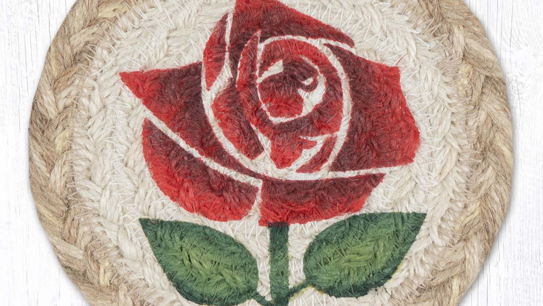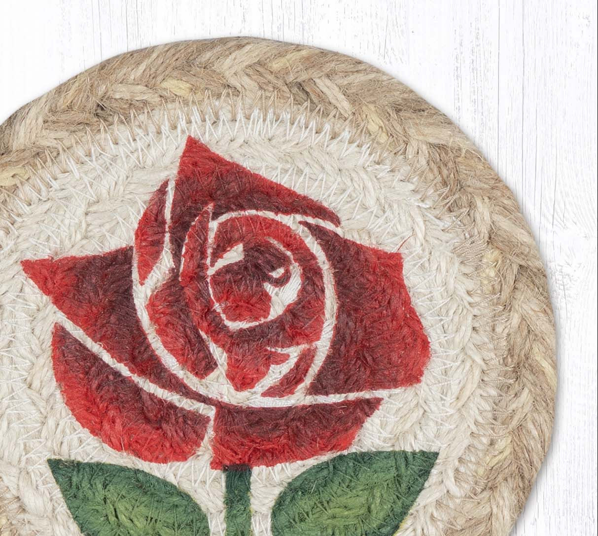 Earth Rugs Stylized Rose Jute Coaster – 5"x5" Round Natural Braided Coaster with Rustic Floral Print