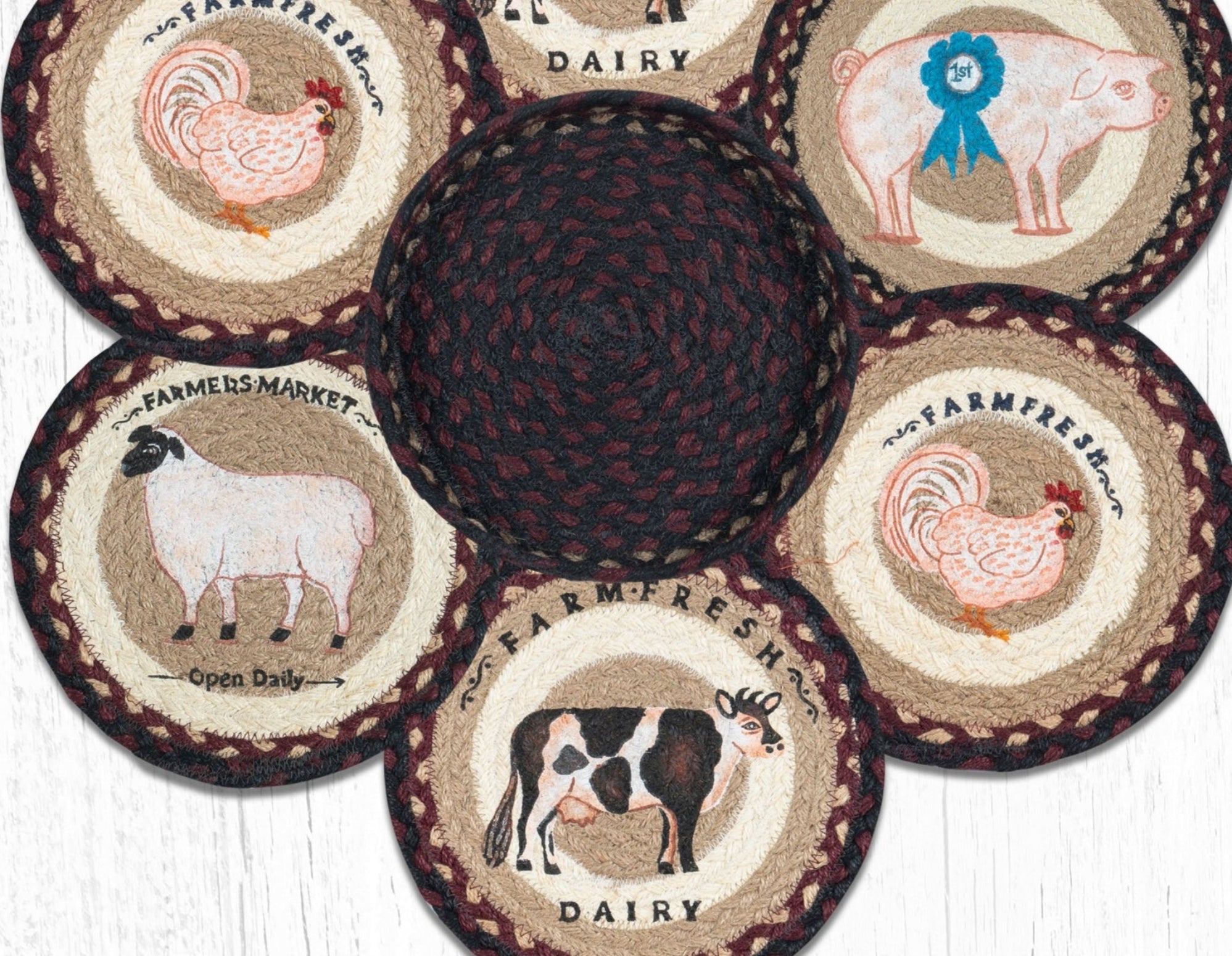 Bring charming country warmth to your kitchen with the Earth Rugs Farmhouse Trivets in a Basket set. This delightful collection includes six 10"x10" round braided jute trivets, each featuring a unique farmhouse-inspired design — from roosters and barns to vintage trucks and stars. Packaged in a natural woven basket, it’s perfect for gift-giving or home display.