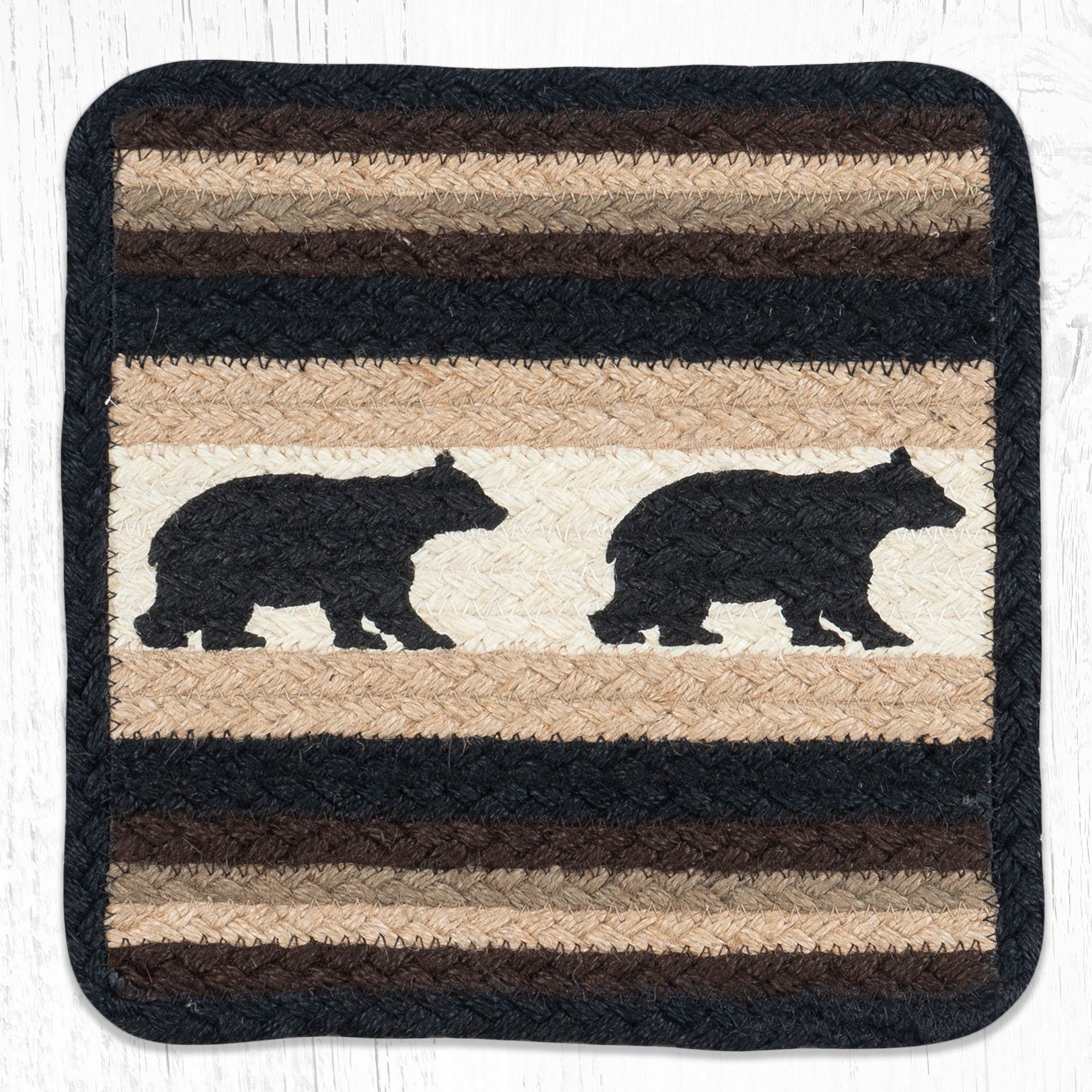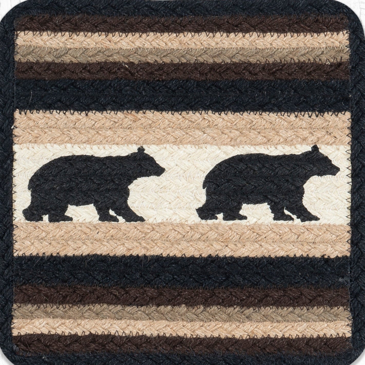 artisan made jute trivet,bear print table accessory,braided jute hot pad,Cabin Bear hot pad,cabin style kitchen décor,Earth Rugs,Earth Rugs handmade trivet,eco-friendly table mat,farmhouse table protector,natural jute kitchen décor,Placemat,rustic jute trivet,rustic woodland décor,square jute trivet,Uber Living,Under $100