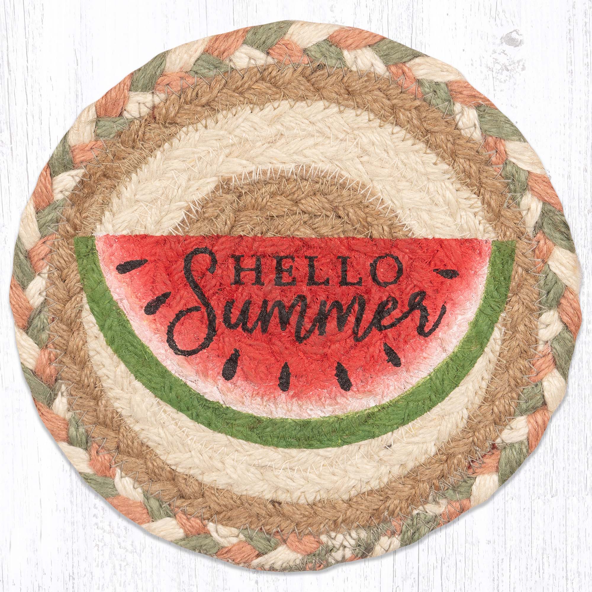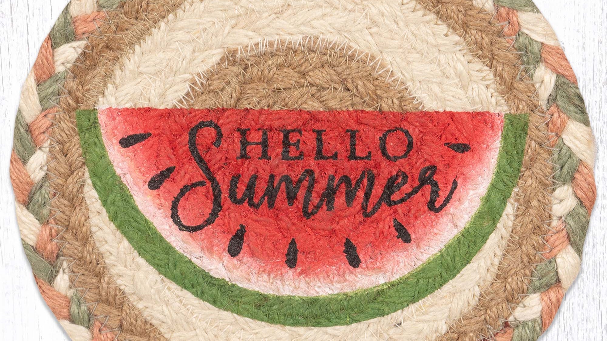 braided jute coaster,decorative watermelon coaster,Earth Rugs watermelon coaster,eco-friendly watermelon table mat,farmhouse fruit round coaster,farmhouse summer décor,fruit motif round drink mat,large 7x7 watermelon round coaster,rustic country coaster,rustic fruit table accent,rustic summer coaster,watermelon coaster