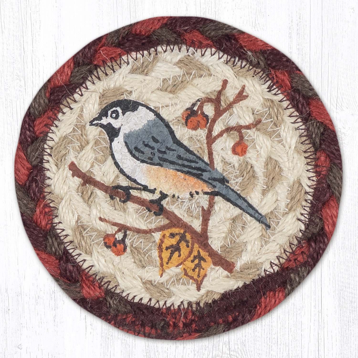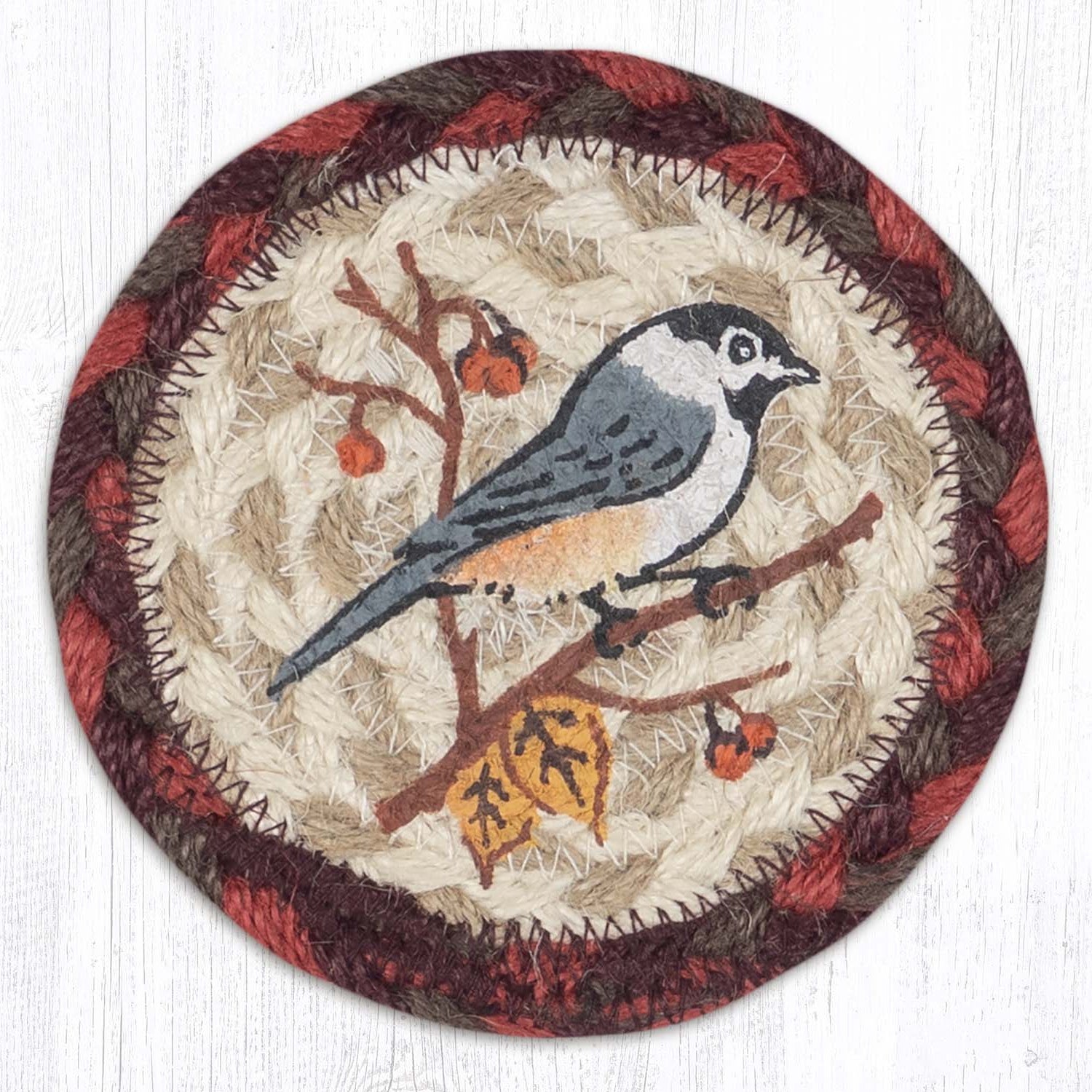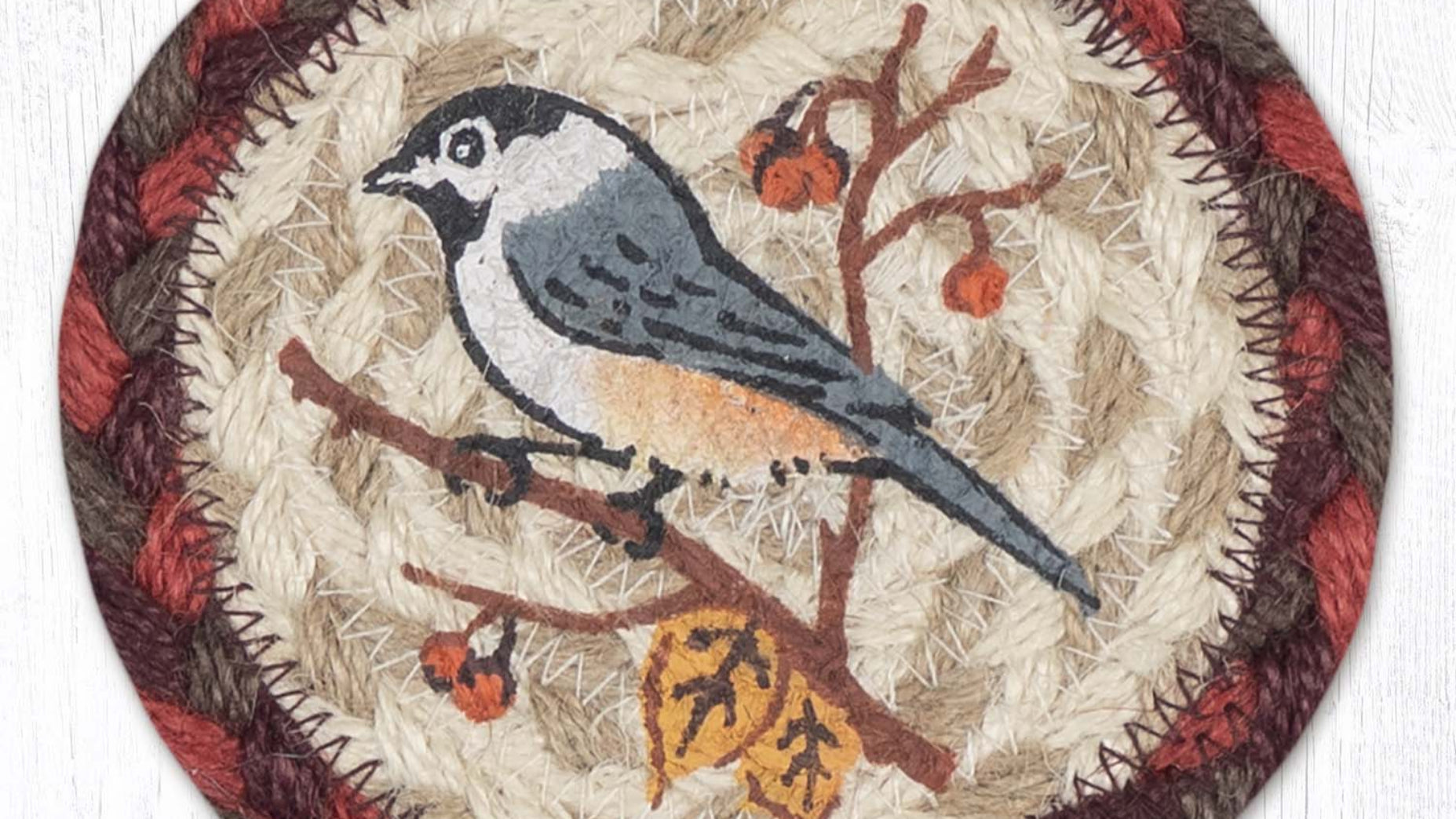 Bring the peaceful charm of woodland wildlife into your home with the Earth Rugs Wildlife Chickadee Printed Coaster. This 5"x5" round coaster is handcrafted from 100% natural braided jute and showcases a delicately hand-stenciled chickadee perched on a branch. Its soft earth tones and rustic texture make it a fitting accent for farmhouse kitchens, woodland cabins, or cozy nature-themed settings. Designed to be both decorative and protective, this eco-friendly piece prevents heat and moisture damage to your furniture. Add a warm, nature-loving touch to any tabletop with this charming coaster.