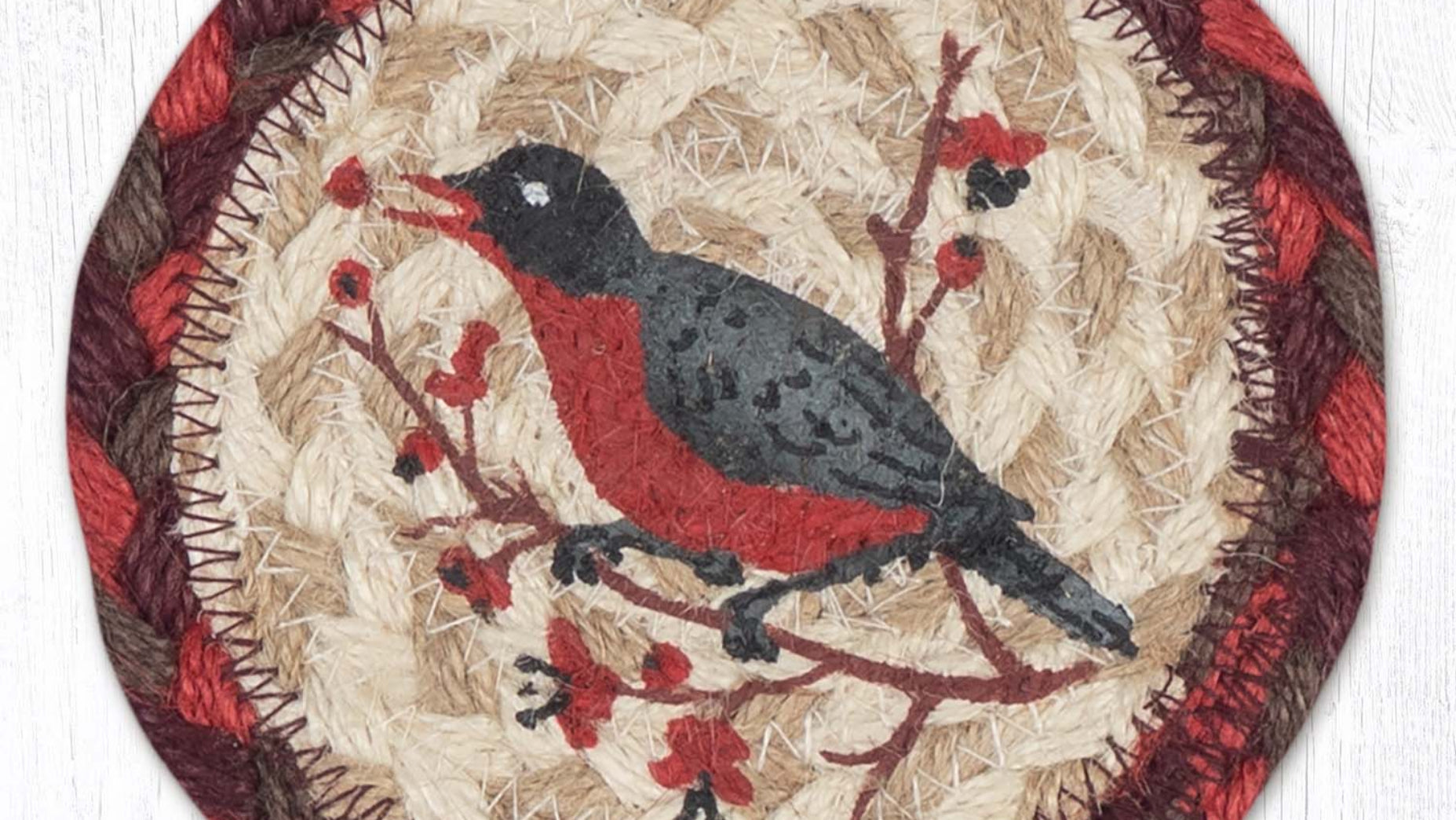 Celebrate nature indoors with the Earth Rugs Wildlife Robin Round Coaster, a charming 5"x5" accent designed to protect your surfaces in rustic style. Featuring a beautifully printed robin motif, this round coaster is made from 100% natural jute, offering a hand-crafted feel that enhances any farmhouse, lodge, or country-inspired space. The braided texture and earth-tone palette blend seamlessly with wood, leather, or metal surfaces, making it ideal for year-round use in kitchens, living rooms, or patio settings. The flat design accommodates mugs, glasses, or small planters, and can be displayed individually or as a coordinated.
